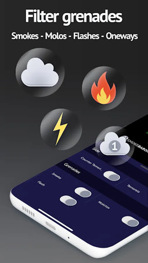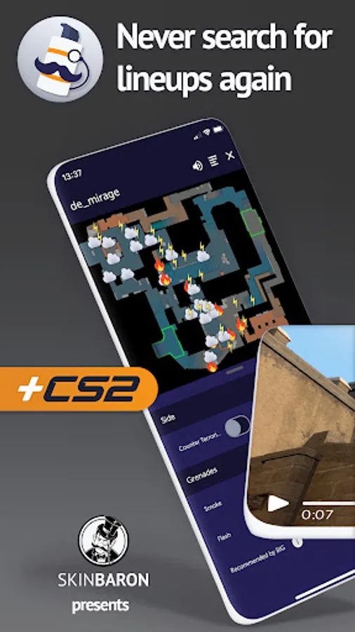Never search for ☁ Smoke, 🔥 Molotov, ⚡ Flash or 🌩️ Oneway grenade lineups again! One app with over 2000 video tutorials on 12 map overviews with callouts (Mirage, Inferno, Dust2, Overpass, Nuke, Vertigo, Ancient, Train, Cache, Iris, Tuscan and Anubis). Download SmokeBaron for quick access to all important grenade lineups in CS:GO and CS2.