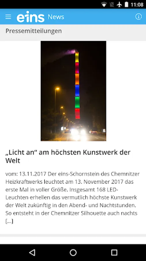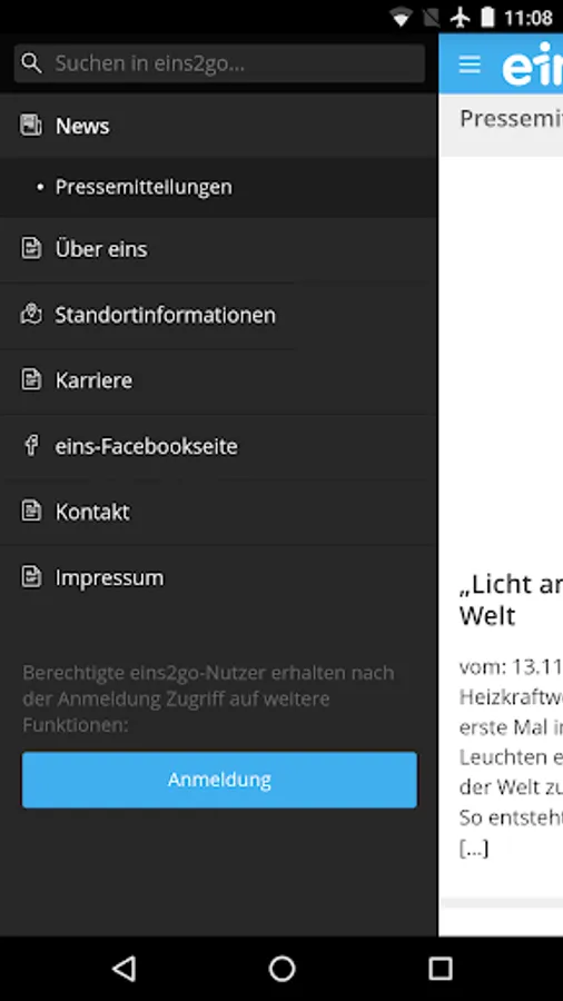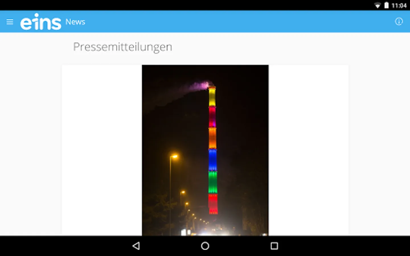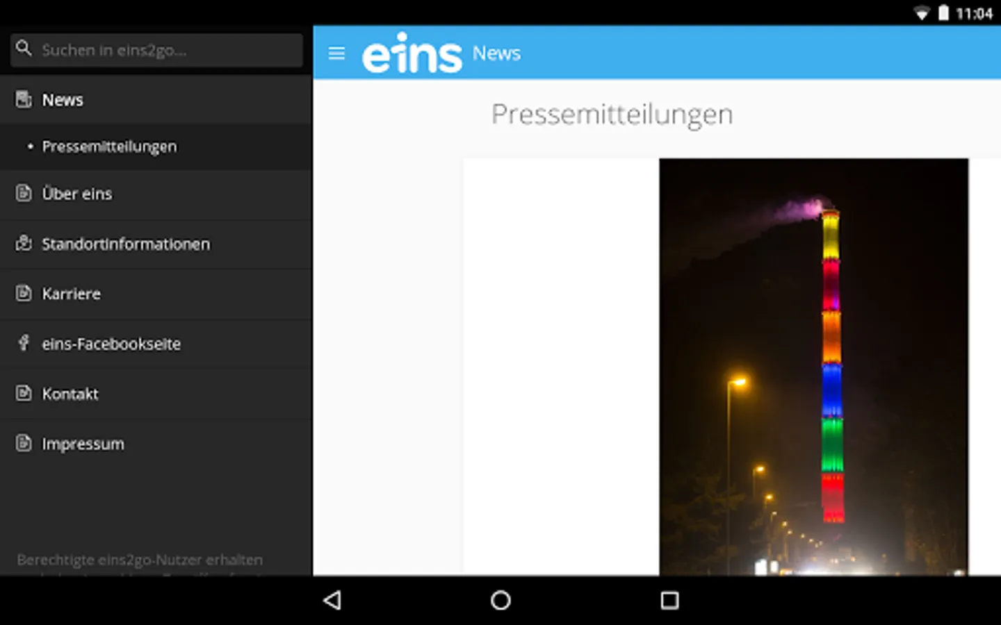 The app eins2go offers you current information about the energy supply company eins energie in sachsen GmbH & Co. KG based in Chemnitz, for example press releases and the latest Facebook entries from the company.