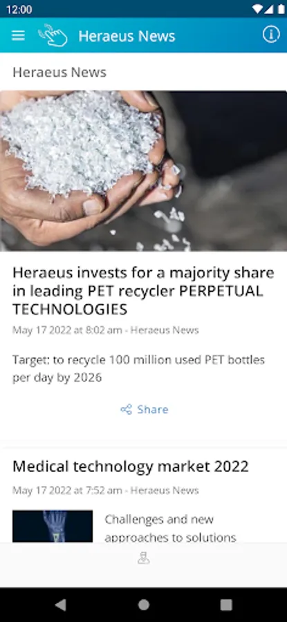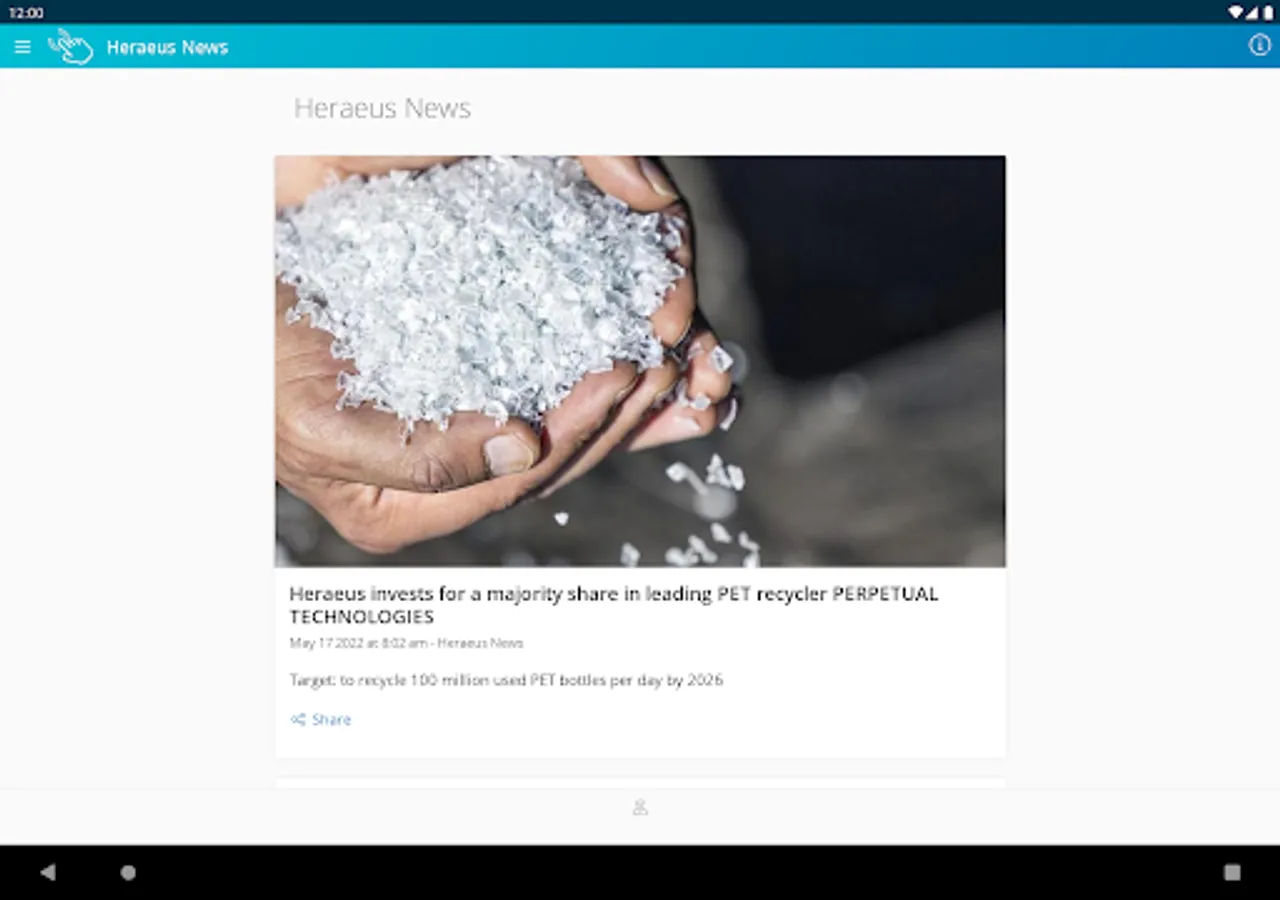 The Newsfeed provides you with the latest news about the company and its business units as well as information on worldwide job vacancies directly to your mobile device. We also provide you with lots of exciting information about product innovations at Heraeus. Thanks to the push notifications, you won't miss any news about us - and you can spread it conveniently via the Share function in your social network. Our trade fair calendar informs you about all current dates when you can meet us.