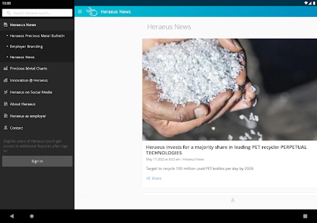 With Heraeus touch, you have access to all the news about the Heraeus Group - bundled in one app. In addition to interesting information on new products from our business units, you will also receive location information, such as availability in our parking garages, so that you are well prepared for your next visit to us.