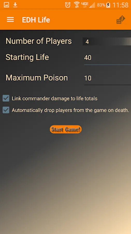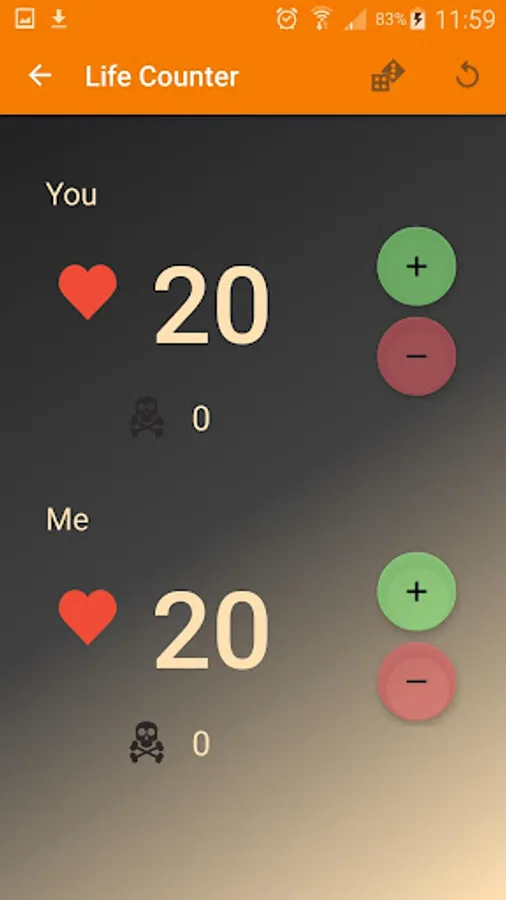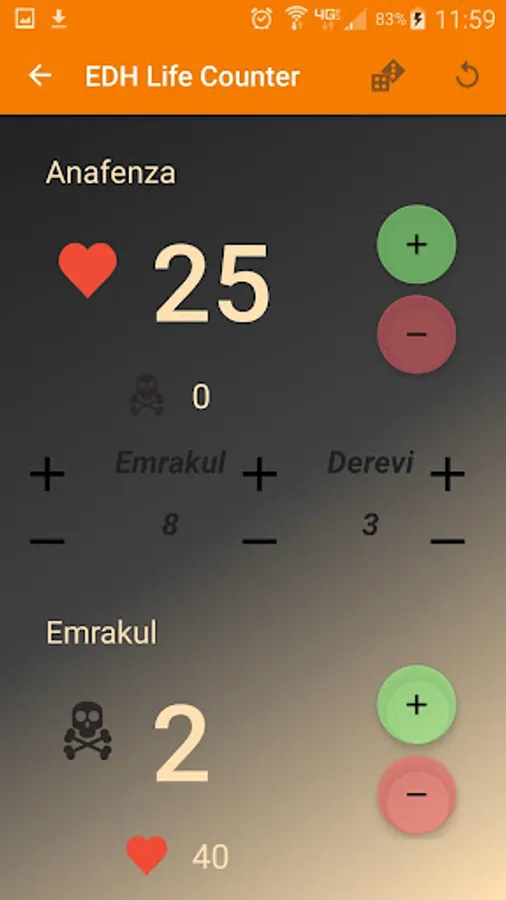 The EDH Life Counter is built with EDH or Commander game play in mind. In addition to the standard format 20 life counter, EDH Life Counter implements a customizable multiplayer life counter that tracks life, poison, and commander damage from each individual commander. Gone are the days of complex tables written on notebook paper!