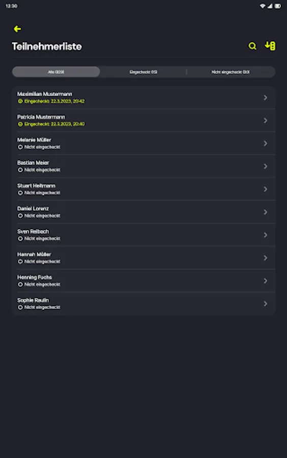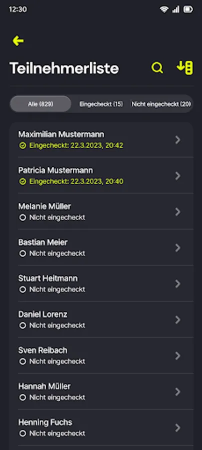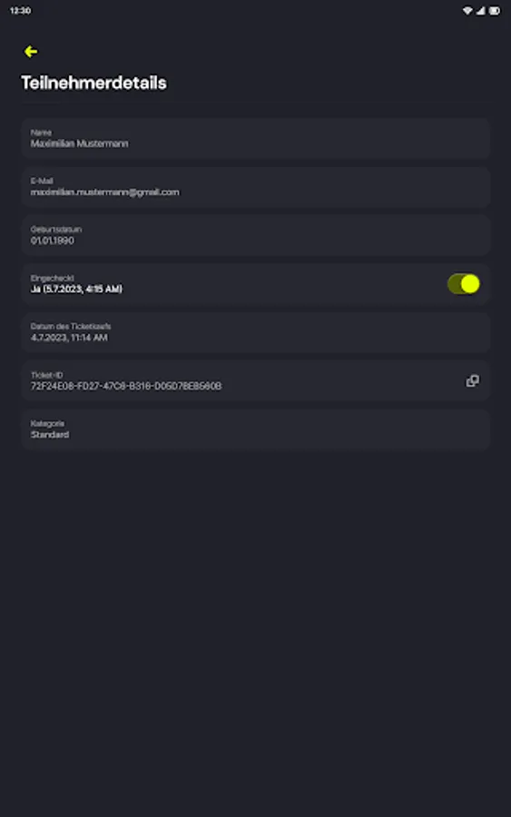 Our user-friendly system allows you to efficiently monitor and optimize the check-in process. With the ticket ID you can see who has already checked in in real time. The info button behind each participant provides you with detailed information such as name, email address, check-in status, purchase date and ticket category. This way you always keep track of your visitors.