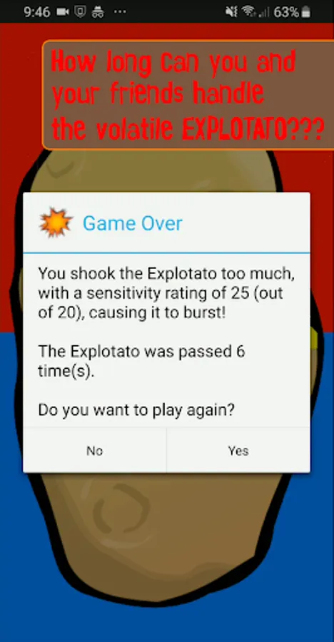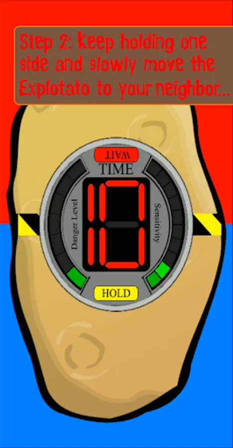 In this game, your mobile device becomes a scalding, volatile spud, and you have to pass it to your friend...QUICKLY! Can you grab one end of the Explotato and take the next 3 seconds to carefully move it closer to your neighbor, then completely transfer it to him/her within at most 10 seconds? Good! Now your friend has to do the same with his or her friend to his or her left/right. However - if any of you shakes the Explotato too much, or runs out of time, the Potato will burst and it's game over!