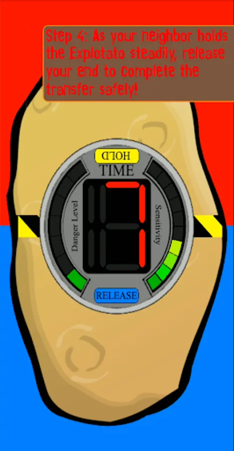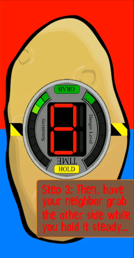 In this game, your mobile device becomes a scalding, volatile spud, and you have to pass it to your friend...QUICKLY! Can you grab one end of the Explotato and take the next 3 seconds to carefully move it closer to your neighbor, then completely transfer it to him/her within at most 10 seconds? Good! Now your friend has to do the same with his or her friend to his or her left/right. However - if any of you shakes the Explotato too much, or runs out of time, the Potato will burst and it's game over!