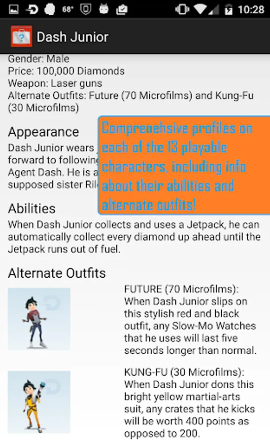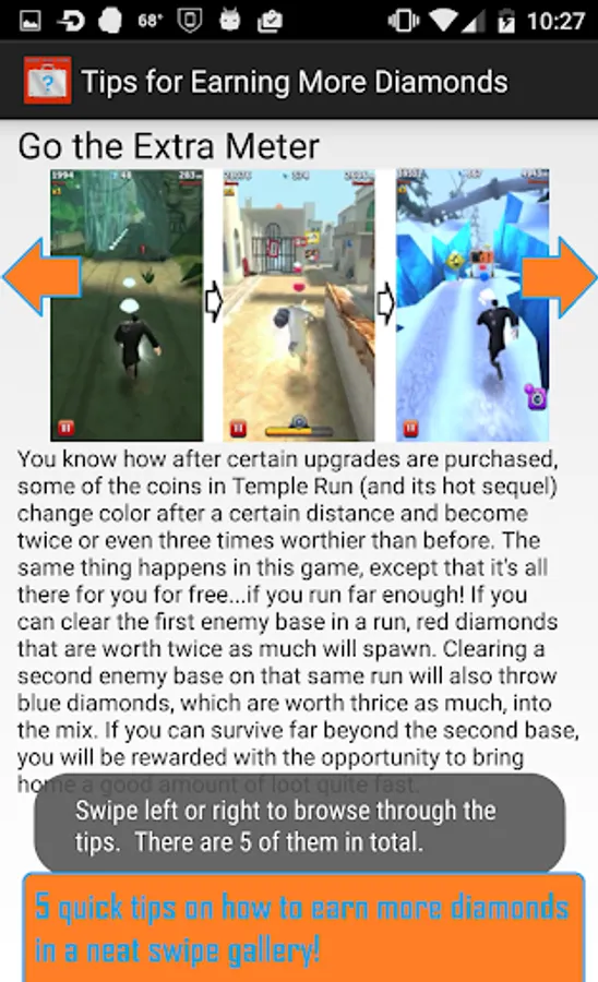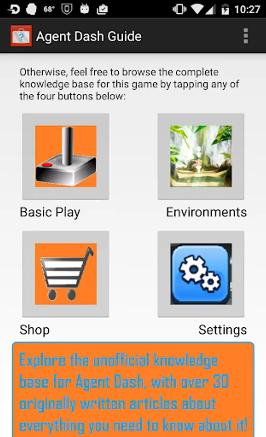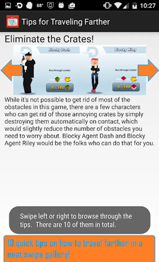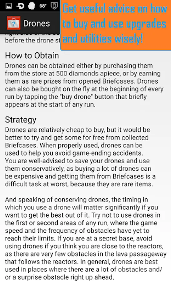 In that game, some players may have issues trying to get a lot of diamonds or avoid obstacles, like the occasional truck in the desert towns. This app is designed to help players fully understand Agent Dash so that they can enjoy it better. It has over 30 originally written articles about everything you need to know about Agent Dash, including: