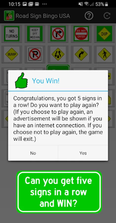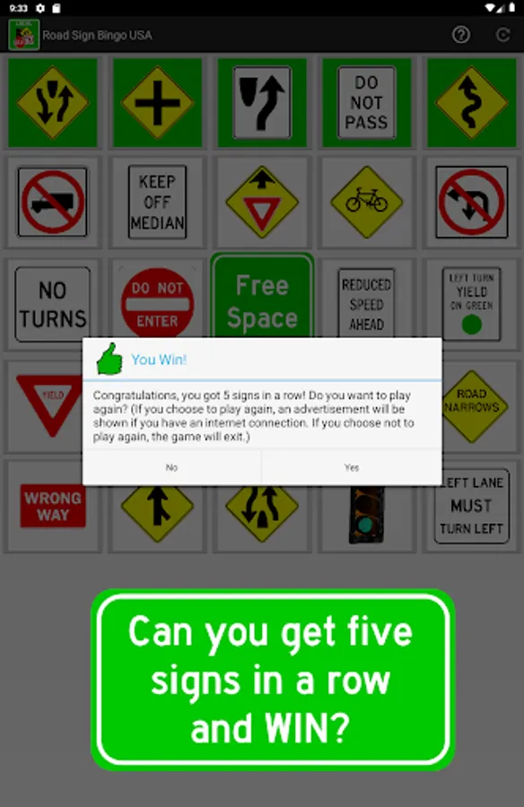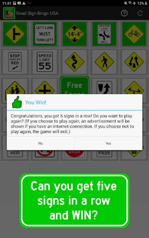 This is the Local Route version of Road Sign Bingo USA, which will display advertisements for Android apps that are rated E or E10+ whenever the board is reset while you are connected to the Internet. To remove these ads, please feel free to play this game offline or drive on over to our Express Route version and drop 99 cents in our tollbooths to enjoy an uninterrupted experience. We appreciate your support.