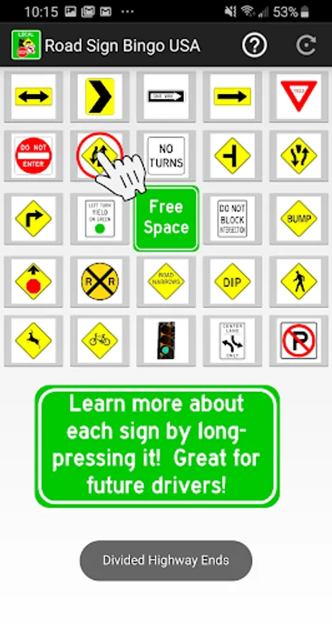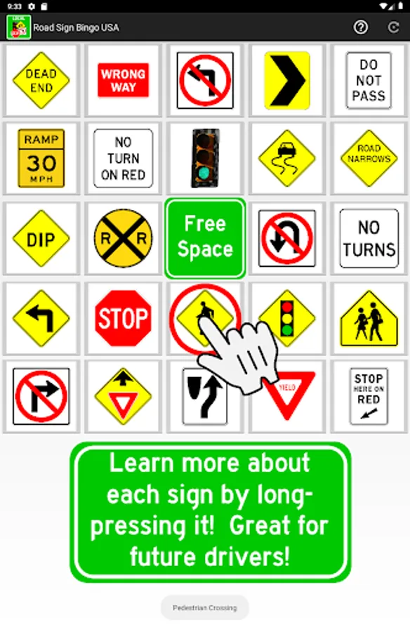 With this simple, minimalistic game, transform your Android phone into a virtual bingo board where you hunt for road signs outside during your trip and try to mark five signs in a row off the board to win! You'll need both luck and a sharp eye to achieve victory!