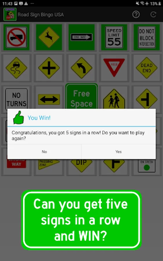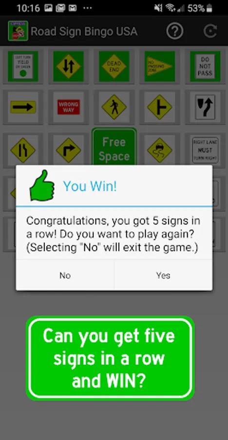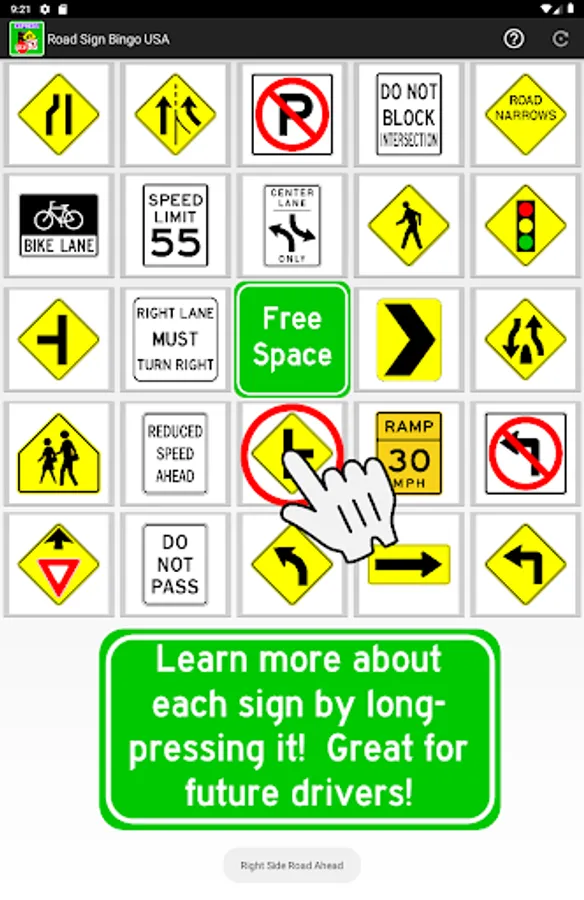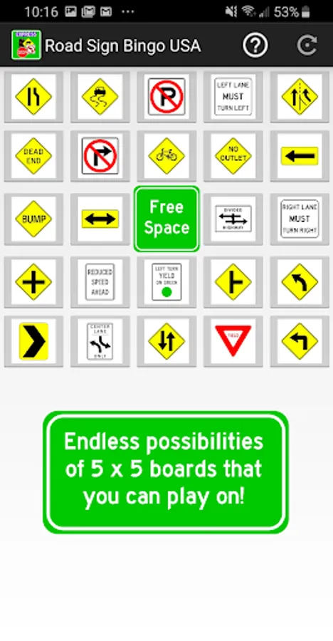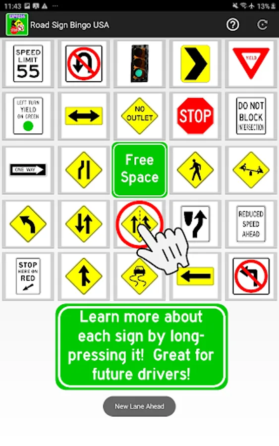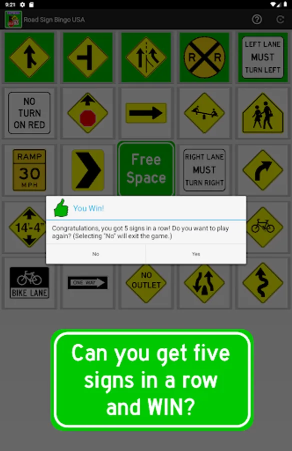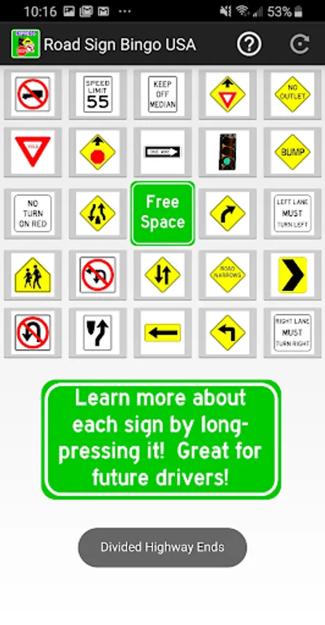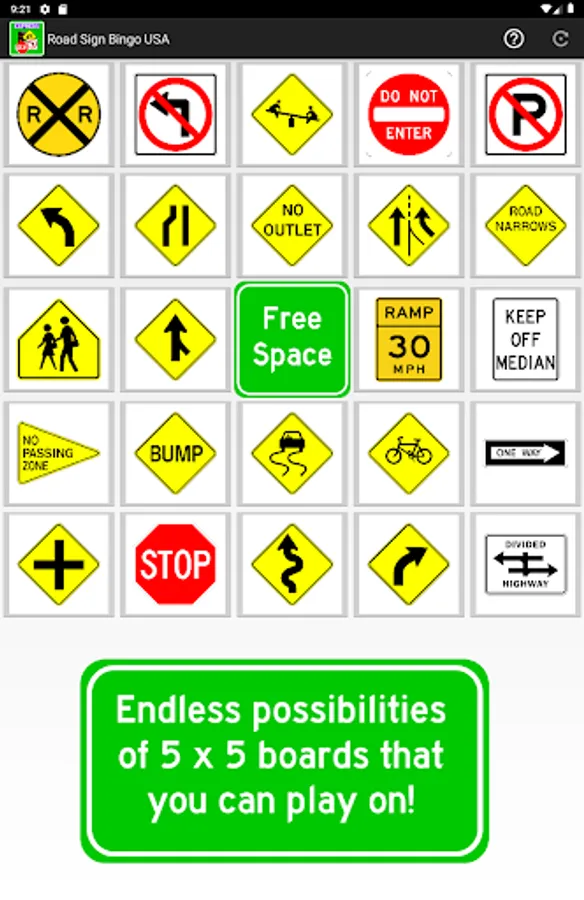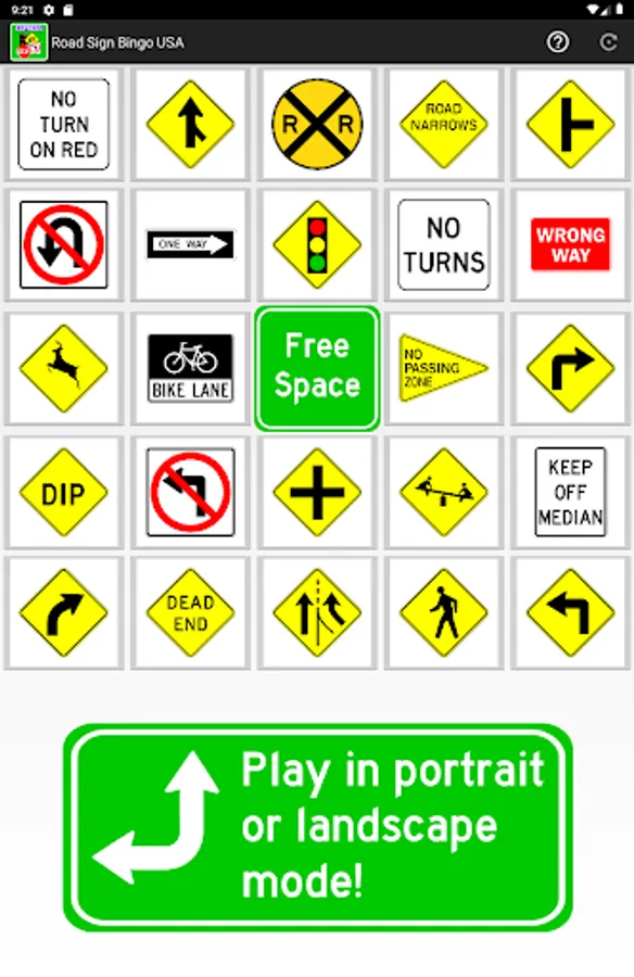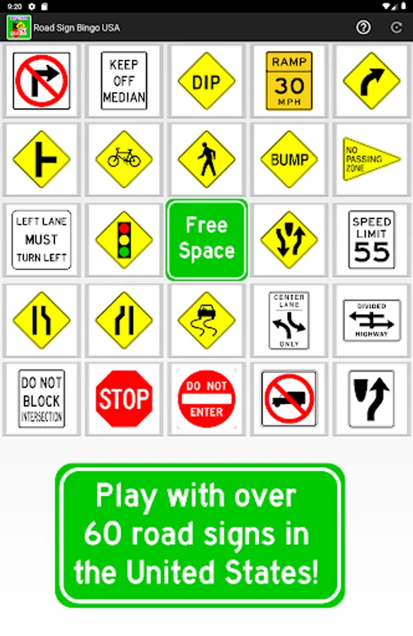 With this simple, minimalistic game, transform your Android phone into a virtual bingo board where you hunt for road signs outside during your trip and try to mark five signs in a row off the board to win! You'll need both luck and a sharp eye to achieve victory!
