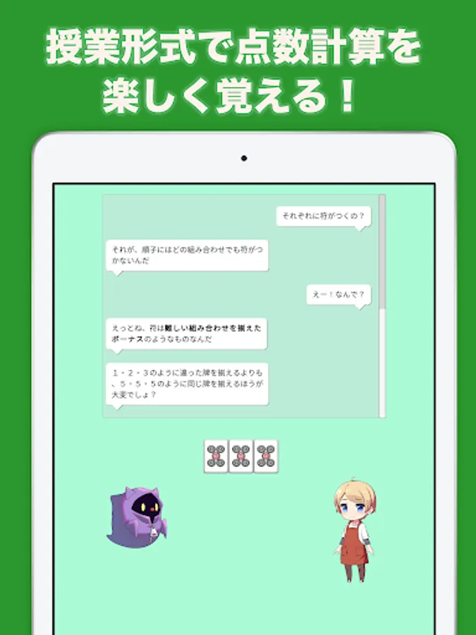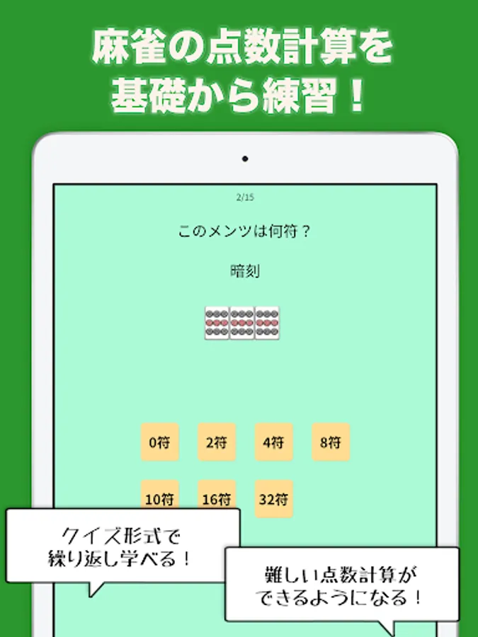 Learn the basic knowledge of mahjong score calculation in class format with "Mahjong score calculation master" and practice in quiz format! Anyone from beginners to advanced players can improve their skills. A must-have app for those who want to master mahjong!