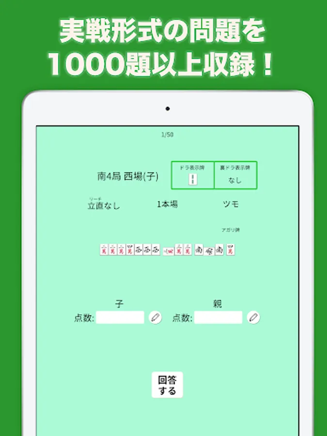 In "Mahjong Score Calculation Master", you can practice practical score calculation using mahjong tiles. Gradually improve your skills by calculating your own score! Also, there is a review function for questions you get wrong, so this app is perfect for those who want to master mahjong score calculations!