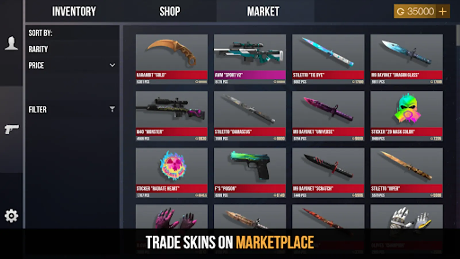 Experience the adrenaline rush of opening cases just like in Standoff 2. Get a taste of the thrill as you unbox a wide range of weapon skins, from common ones to the arcane, elusive ones. Will you be lucky enough to find karambit gold skin?