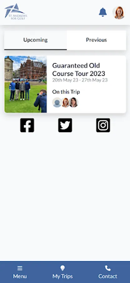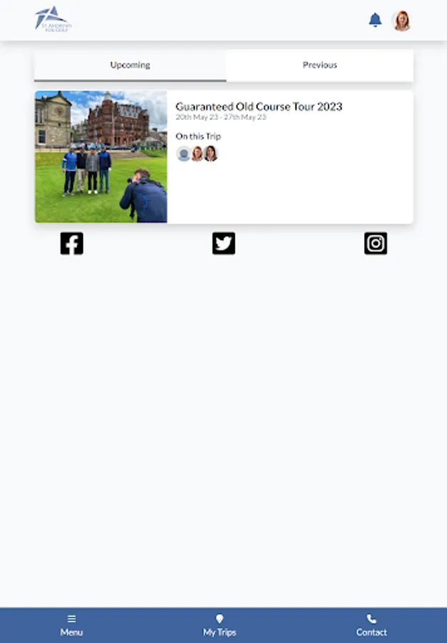 The main navigation page displays all vacations that the client has booked with St Andrews for Golf. This includes upcoming and previous vacations. This previous vacations allows clients to view the itinerary of all previous vacations that they have been on with St Andrews for Golf.