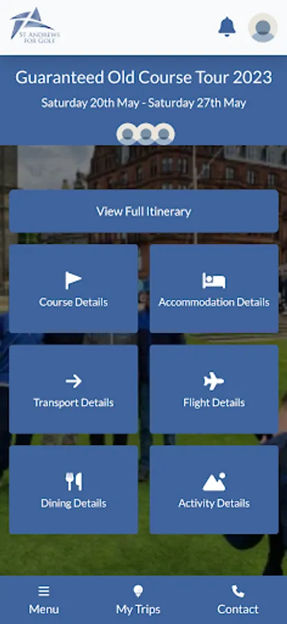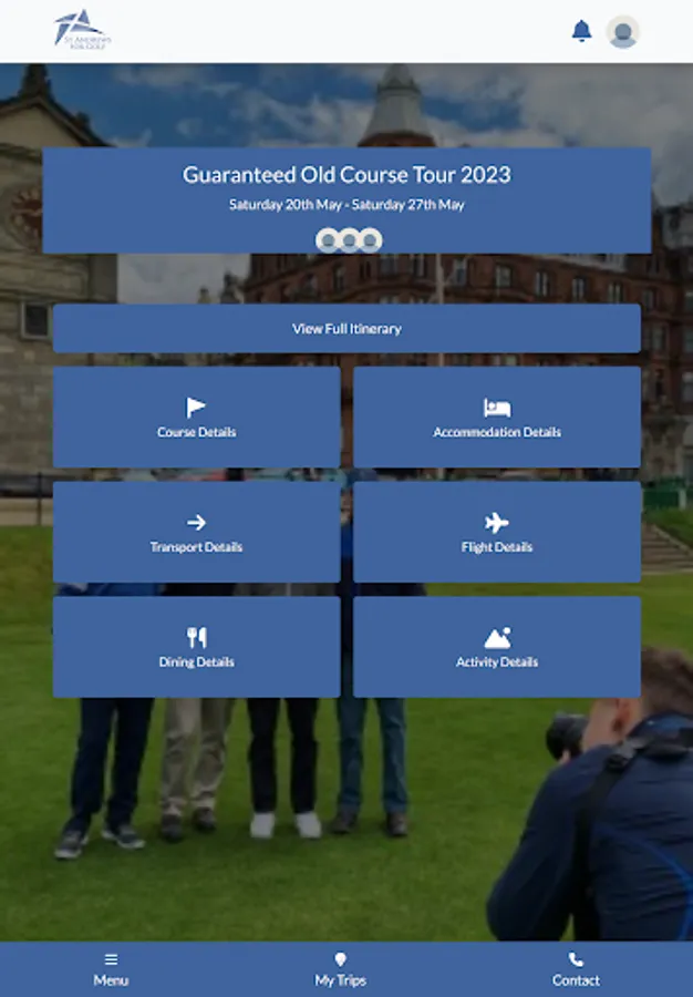 Once a client has confirmed their golf vacation with St Andrews for Golf, the full functionality of the app will be available. The following features give the luxury vacation experience a further customised edge: