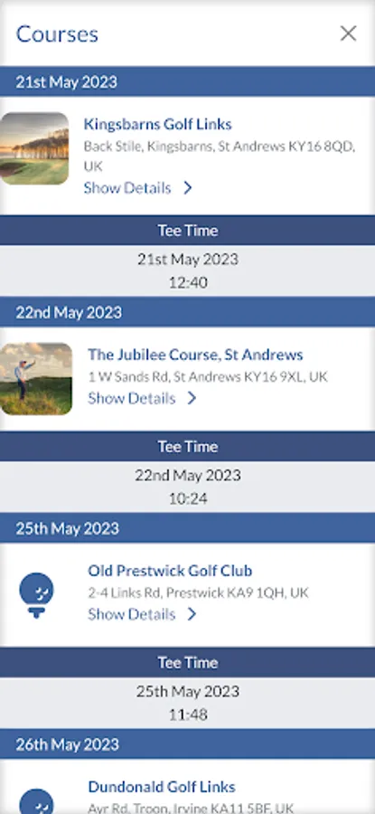 2. Course details – lists all golf courses that will be played, including date, tee time, and any additional information about their golf reservations
