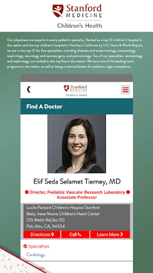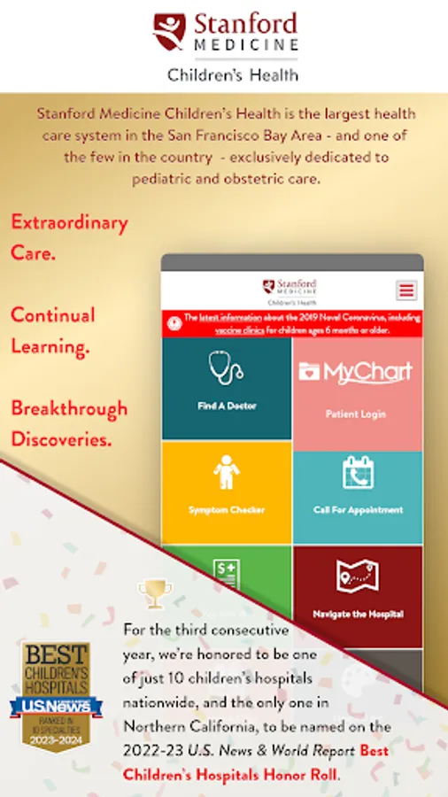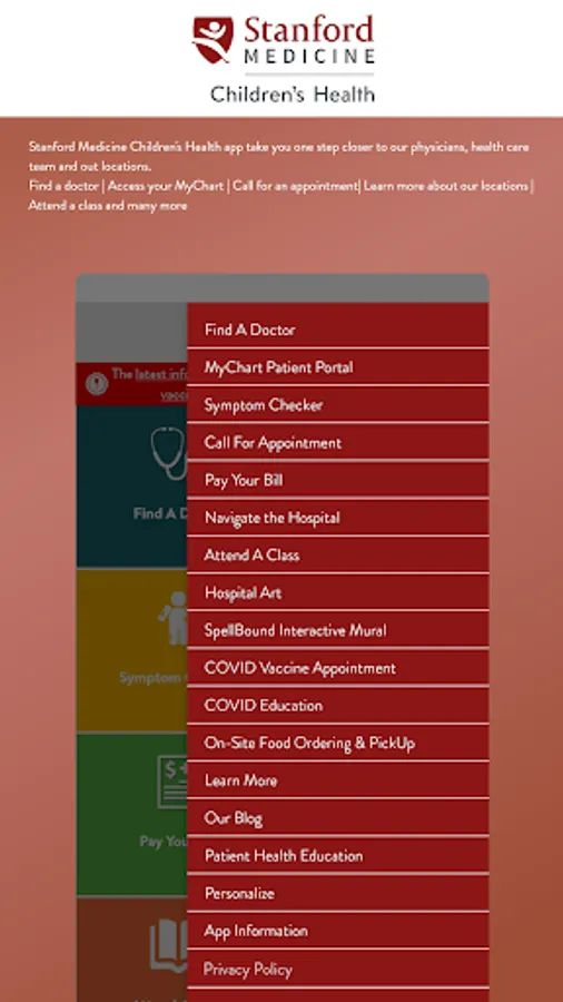 Stanford Children’s Health Mobile App includes a home app with access to number of mobile apps from within the home app for our patients and families to promote patient engagement and improve our patient and family experience. With our App, patients and families will be able to access their child's health information and can even upload vital signs for physician review.
