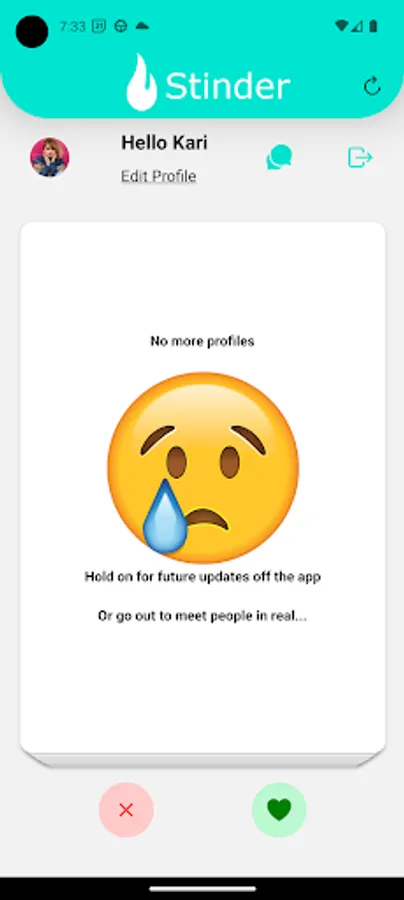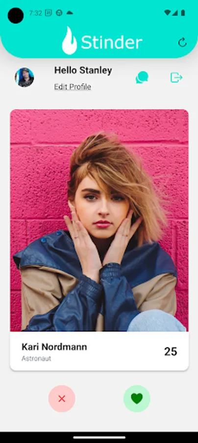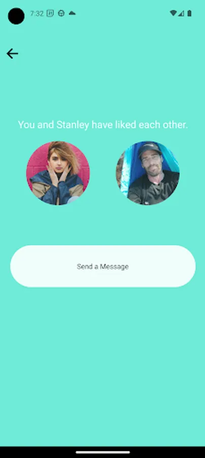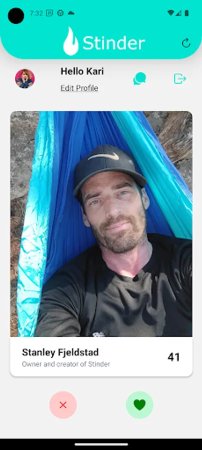 Sveip til venstre for å avvise, sveip til høyre for å like. Hvis begge sveiper til høyre, kan dere matche og deretter chatte i sann tid.