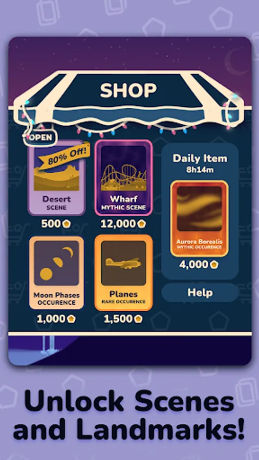 Travel across various Scenes, levelling them up to unlock special and exclusive Landmarks, like an Oasis in the Desert scene, or a Ferris Wheel along the Wharf. The better you play the game, the more Gems you can earn to spend on even more sights to see, like the Aurora Borealis or a firework display! Catch the early morning fog, or unlock birds that return home to roost at sunset. The more you play, the more you're rewarded.