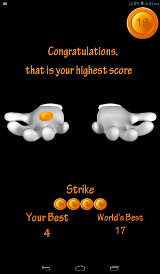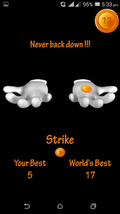 Games we played in our childhood was real fun, right? The famous childhood game of guessing which hand has the coin is here now to bring back those childhood day's fun. The game is natural and purely based on luck, so have fun guys. On a serious note, of course winning one strike (one round) is about luck but don't make mistake in considering it as a luck based fun game. It is all about patience, to get on the leader board, it is not easy. It will be challenging to sustain as loosing streak will be very frustrating. So the real game is with yourself. How much patience you have? if you feel you have edge over a normal human being when it comes to patience, well then this game is designed for you.