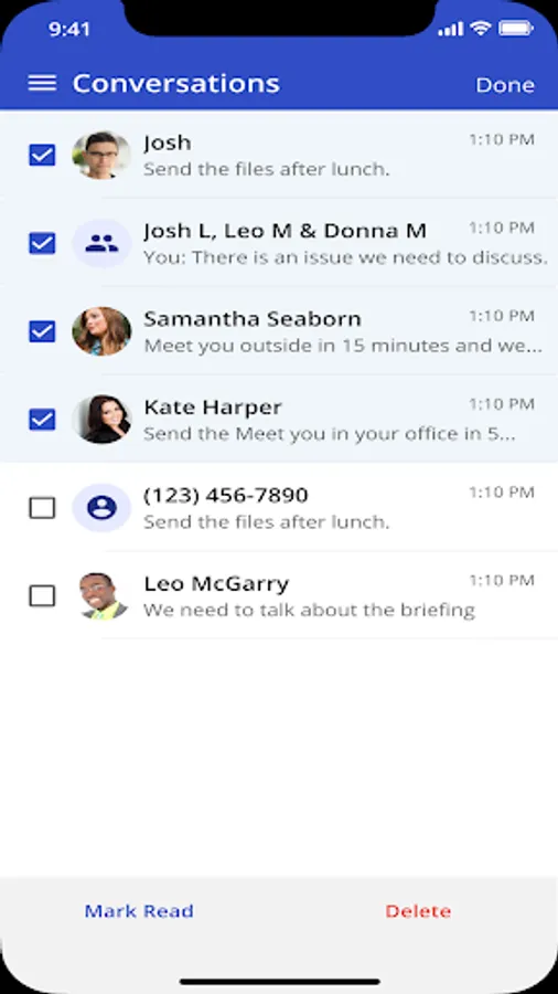 Manage text messaging activities with the ability to multi-select message threads to manage conversations, long press on single messages to perform specific actions, and delete at the Conversation and Messaging levels.