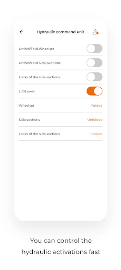• Hydraulic command: Activate each hydraulic activation connected to the implement, such as the lift and lower equipment, unfold and fold the wheelsets and sides, and lock and unlock the sides.
