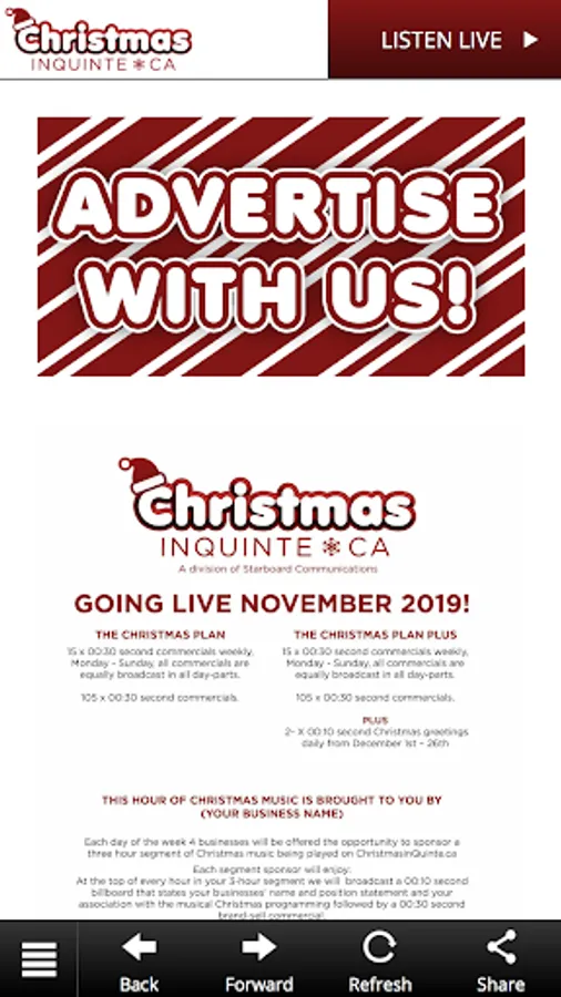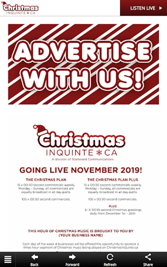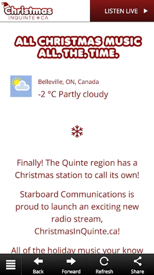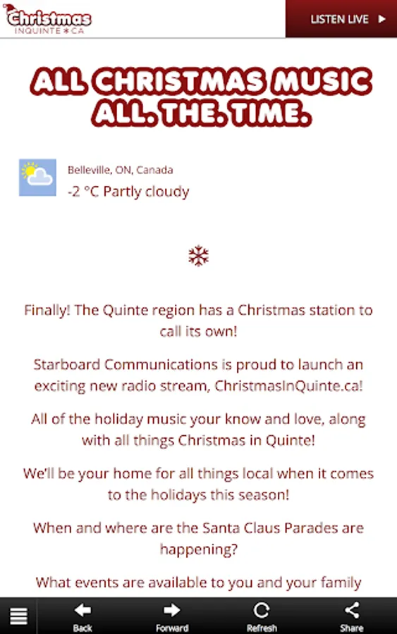 Finally! The Quinte region will have a Christmas station to call its own! Starboard Communications is proud to launch an exciting new radio stream, ChristmasInQuinte.ca! All of the holiday music you know and love, along with all things Christmas in Quinte! We’ll be your home for all things local when it comes to the holidays this season! When and where are the Santa Claus Parades are happening? What events are available to you and your family over the holidays? What does the holiday weather forecast look like? Everything Christmas, everything local! Welcome to the all-new, ChristmasInQuinte.ca! All Christmas Music. All the time.