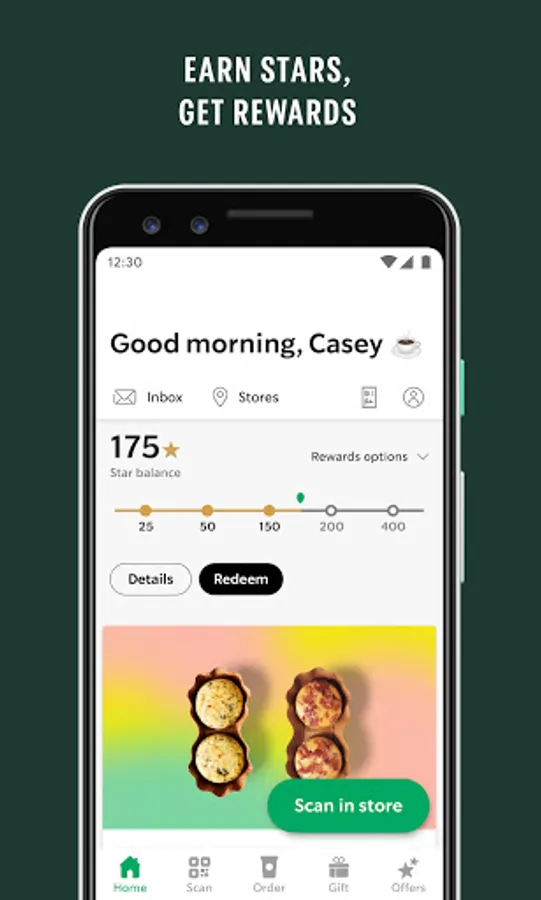 The Starbucks® app is a convenient way to order ahead for pickup, scan and pay in-store and customize your favorites. Rewards are built right in, so you'll earn Stars towards free drinks and food on your purchases.