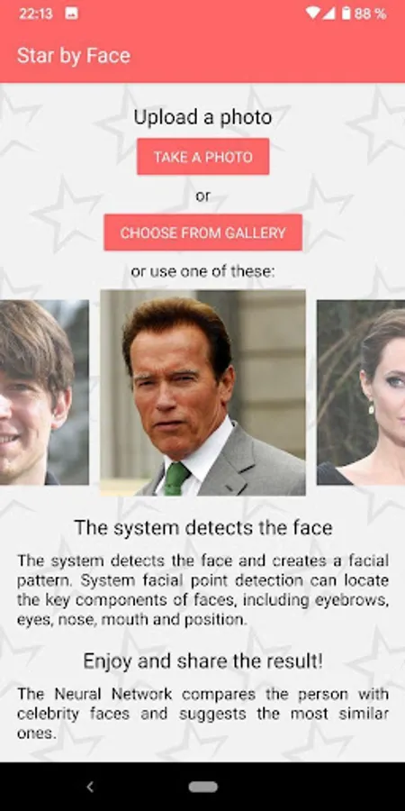 - Easy-to-use interface: Simply upload a clear photo of yourself, and let StarByFace do the rest!