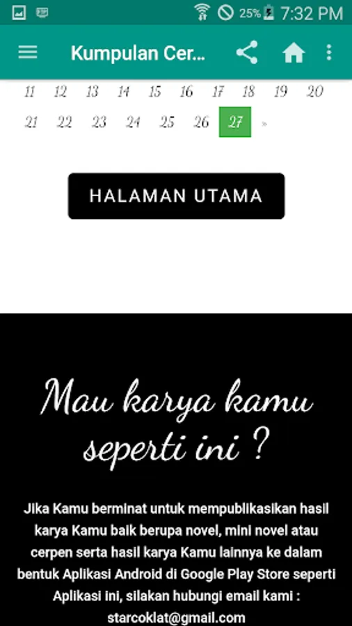 If you are interested in publishing your work in the form of novels, mini novels or short stories as well as your other works in the form of an Android application on the Google Play Store such as this application, please contact our email: starcoklat@gmail.com