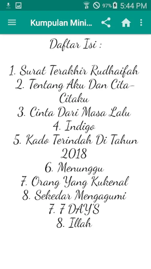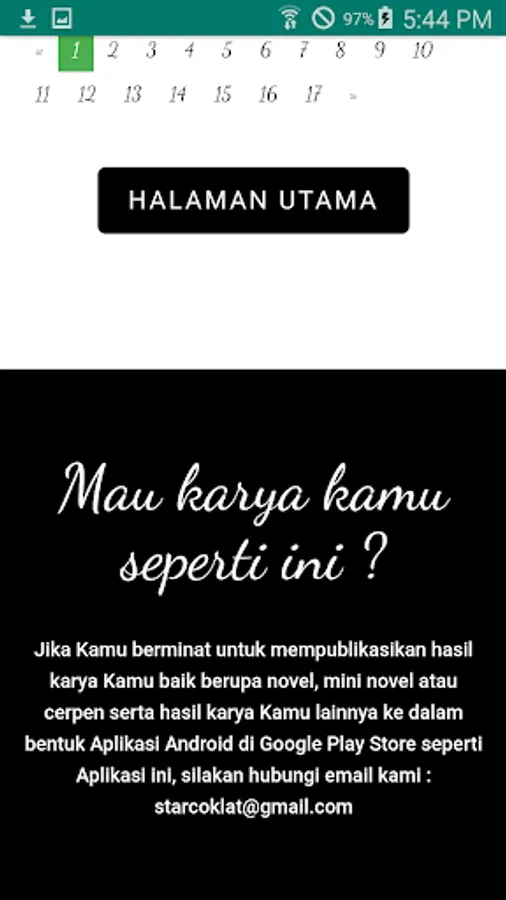 If you are interested in publishing your work in the form of novels, mini novels or short stories as well as your other works in the form of an Android application on the Google Play Store such as this application, please contact our email: starcoklat@gmail.com
