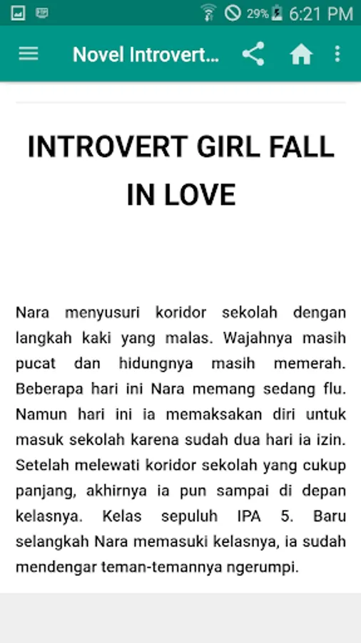 Nara is a closed and happy girl to make friends with new people. He only has a few close friends at school. Nara never felt the name fell in love even going out. Until one day came a new student named Davin. Davin always disturbs Nara and follows where Nara goes while at school. Nara who doesn't like Davin is of course angry. But one day, there was an incident that made Nara's feelings change to Davin. What event is that? And what will happen next to Nara and Davin? Curious? Download this novel immediately!