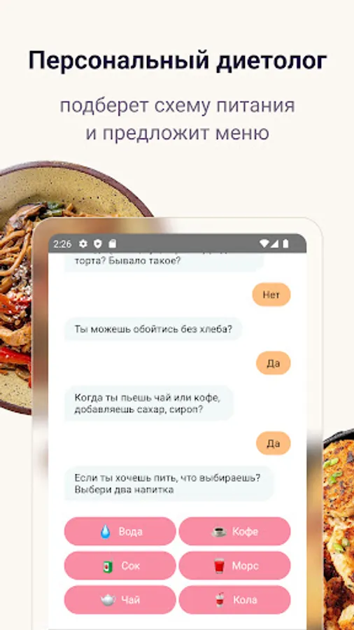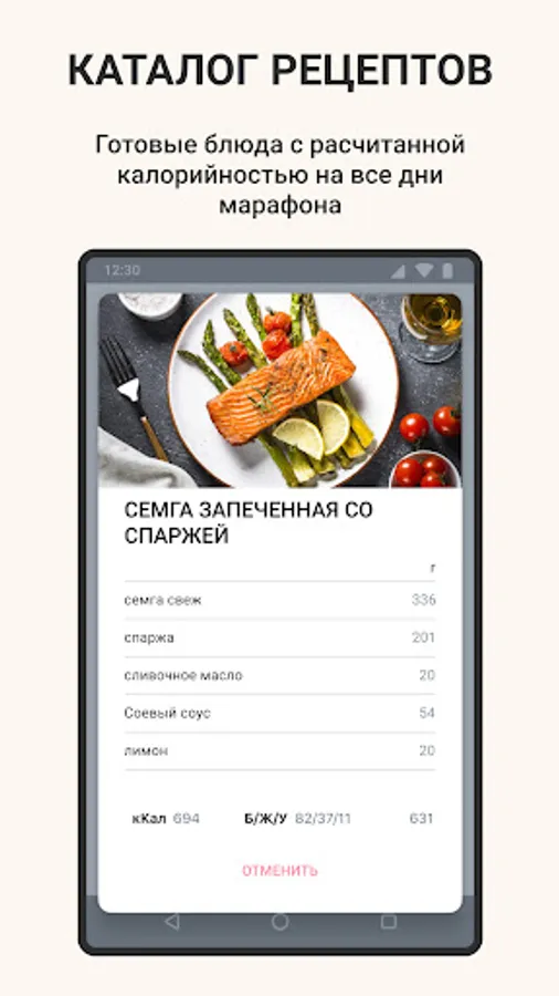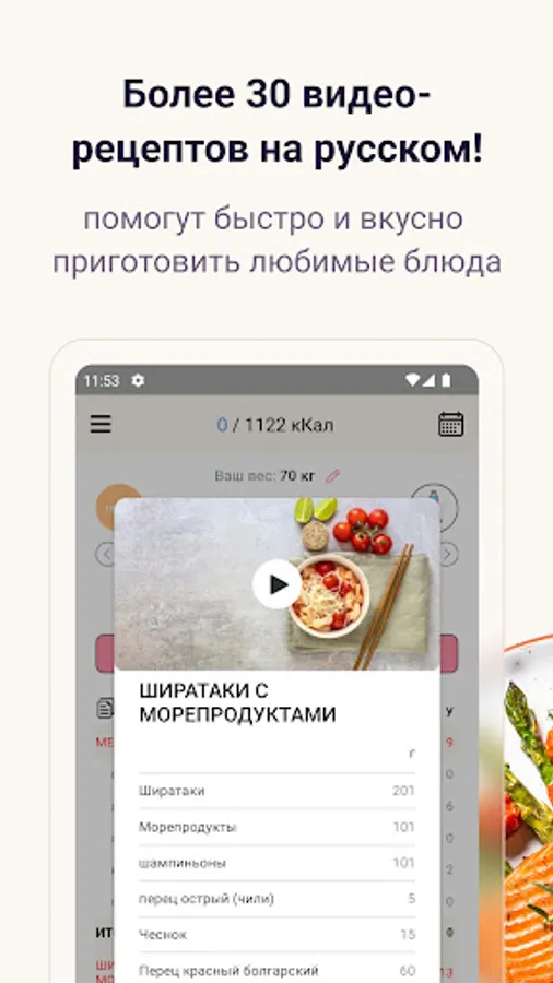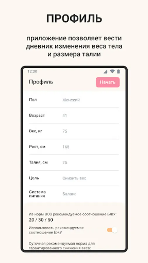 - Возможность индивидуального изменения параметров КБЖУ и нормы потребления воды.