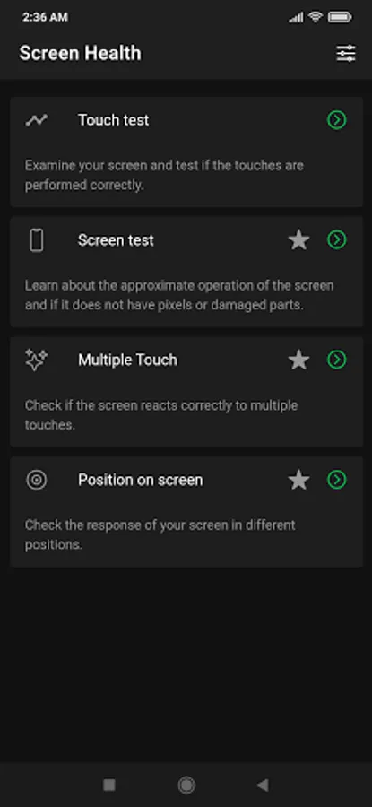 Screen Health allows screen tests to check for damaged pixels, multi touches, and display response. In simple steps discover the status of the screen and if there are problems, what they are and their exact location.