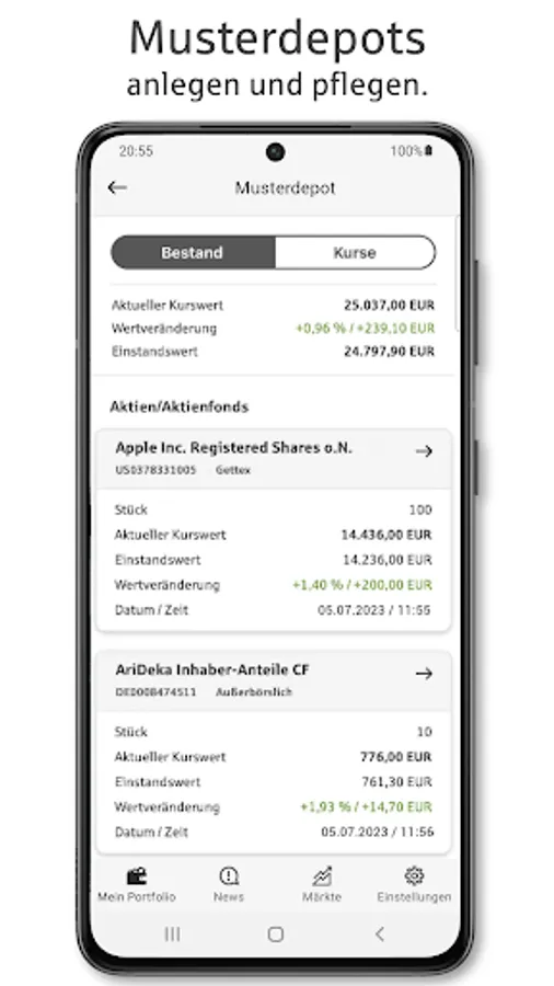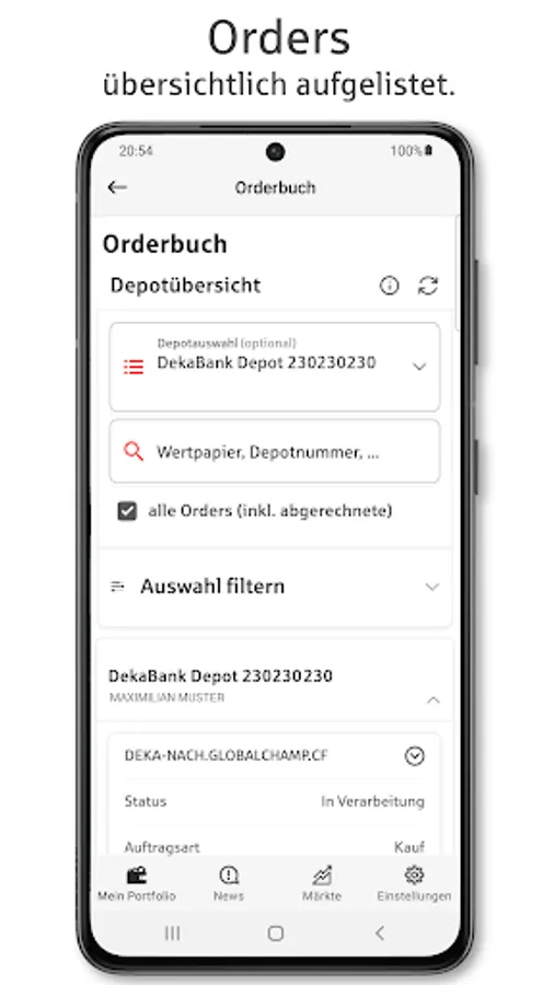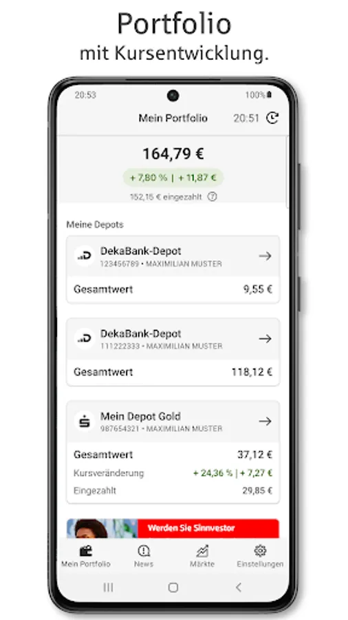 • Set up any number of custody accounts that you maintain with your savings bank or with a securities partner of the savings banks (DekaBank (deka.de), S-Broker, bevestor, fyndus, DepotMax) and other banks