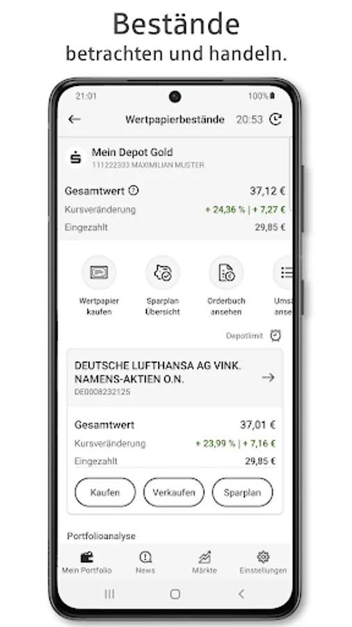 S-Invest includes many functions: Transactions such as buying and selling up to maintenance of the savings plan are possible at any time. All stock exchanges, direct or limit trading places where the value is traded are available to you. National, international and with the supported limit functions.