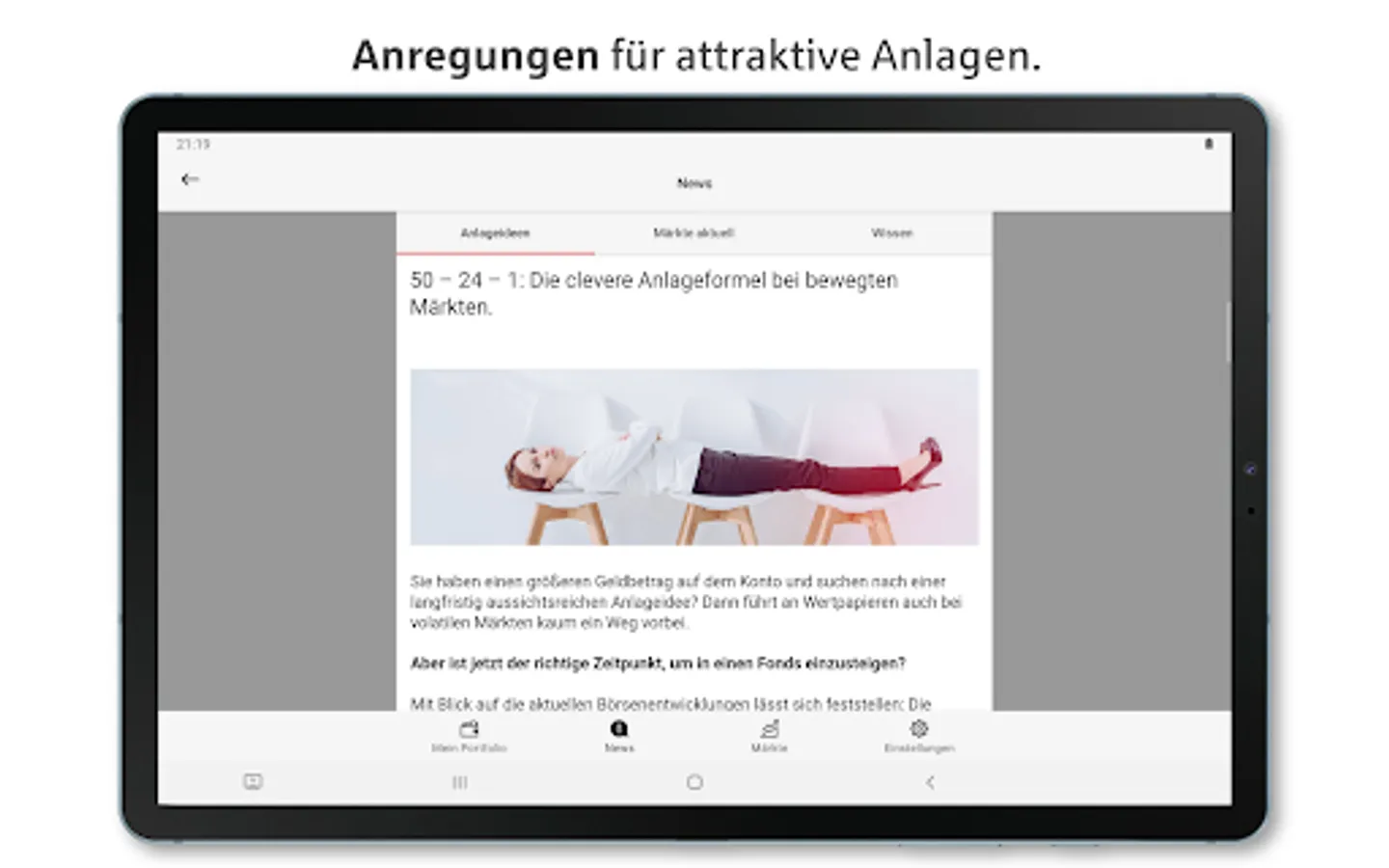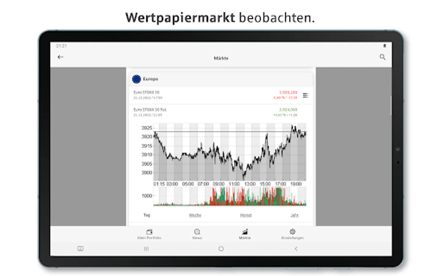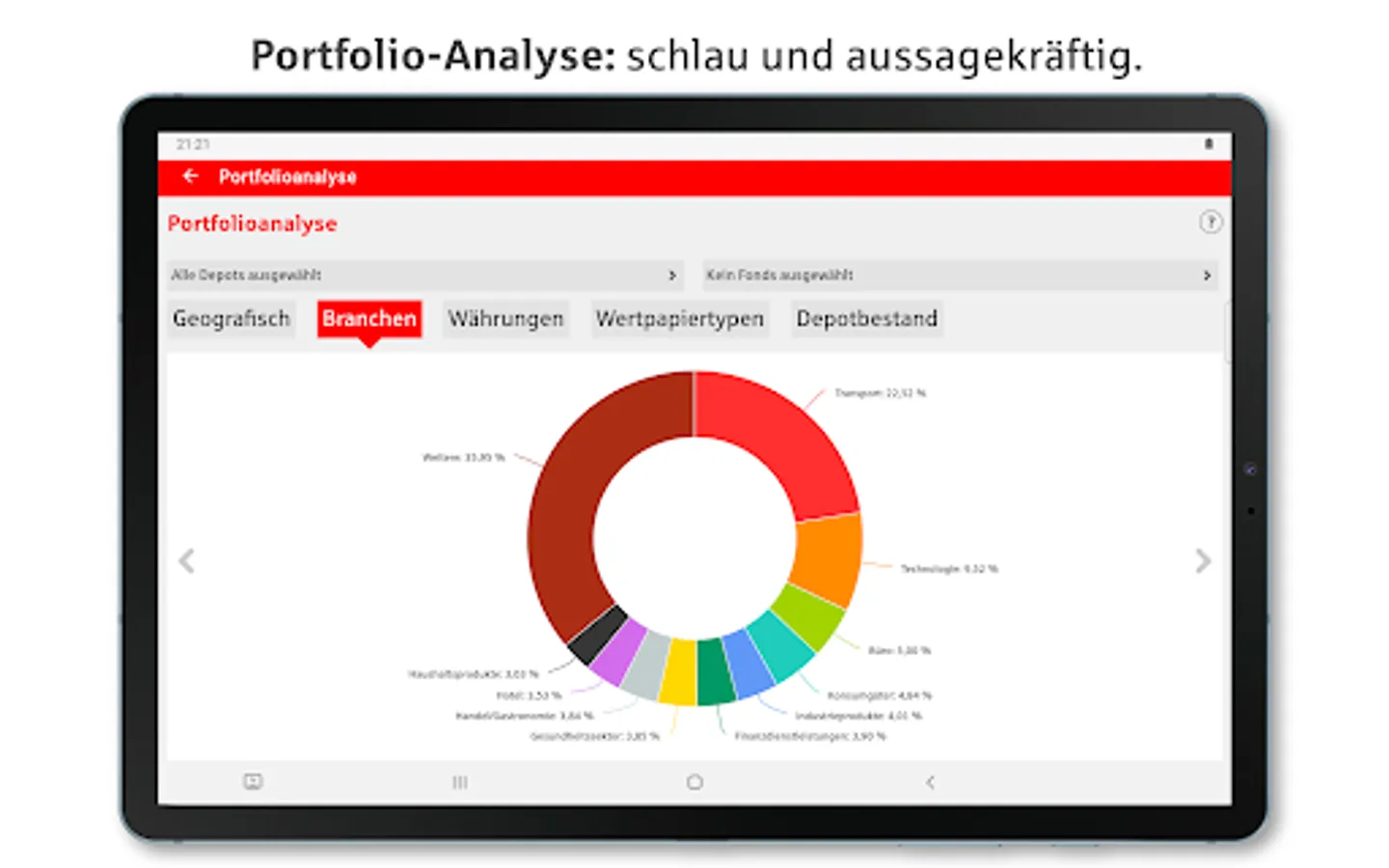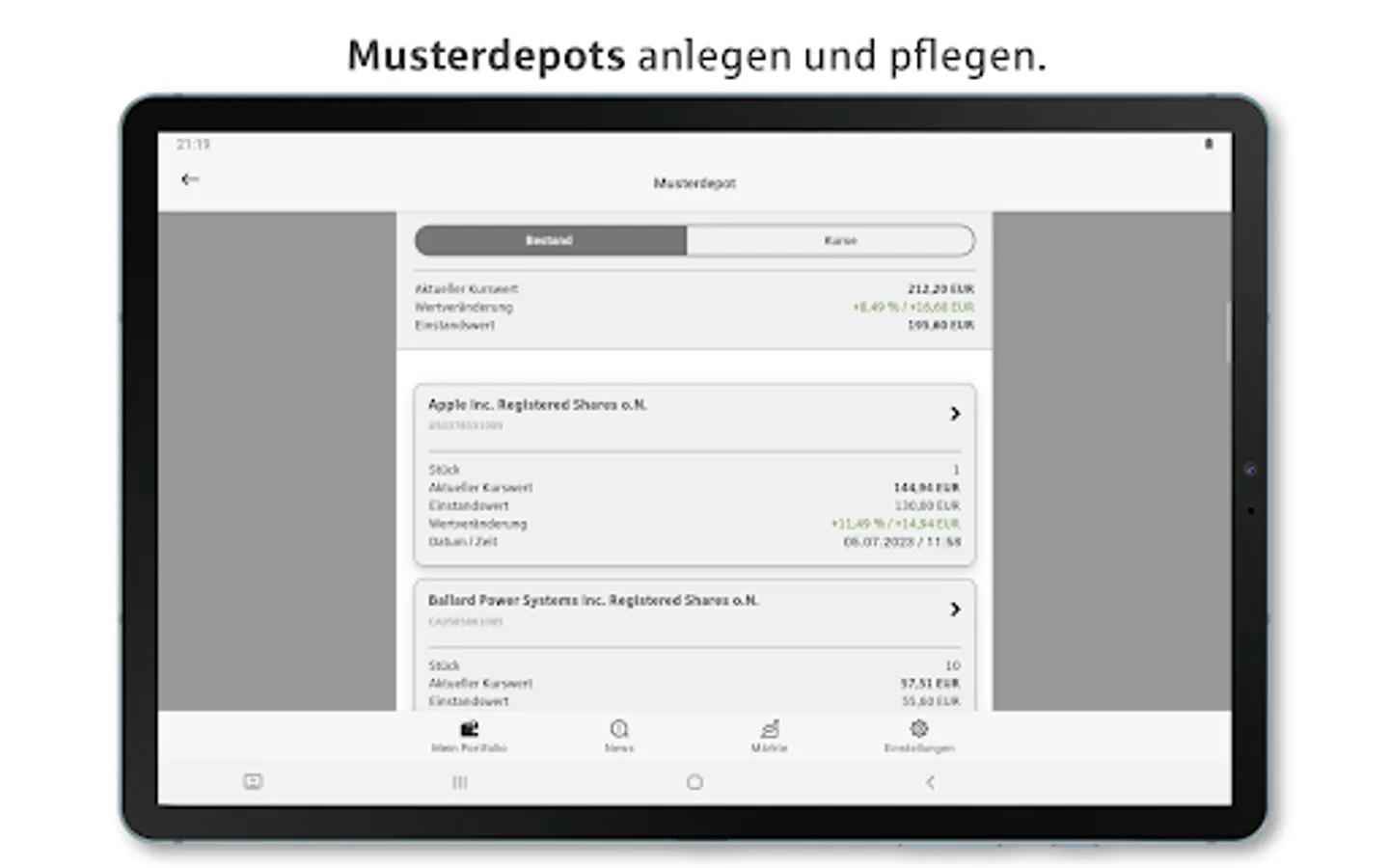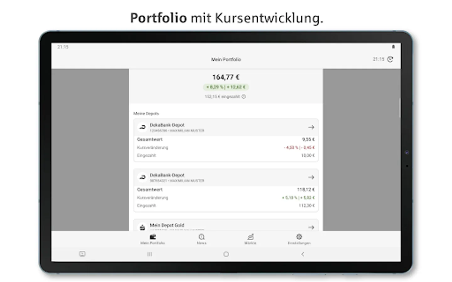 • Detailed view of securities: investment products, price development, price changes in percent and currency, deposits, total value and much more.