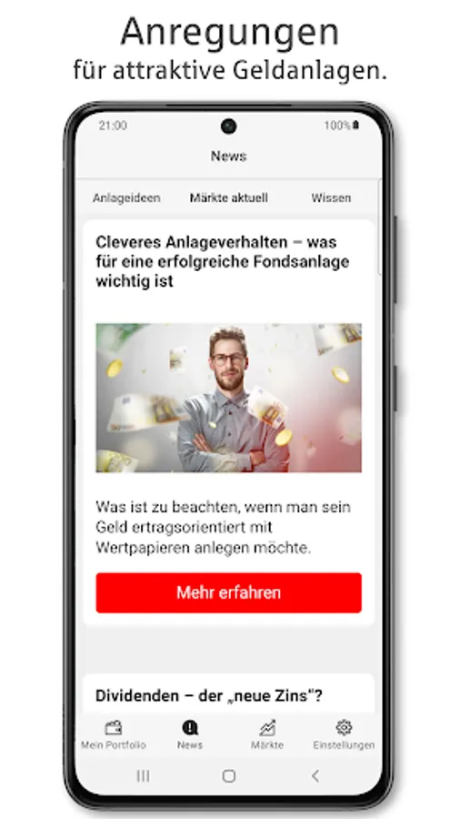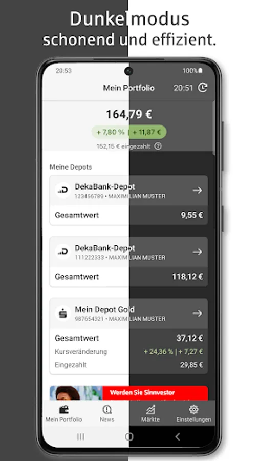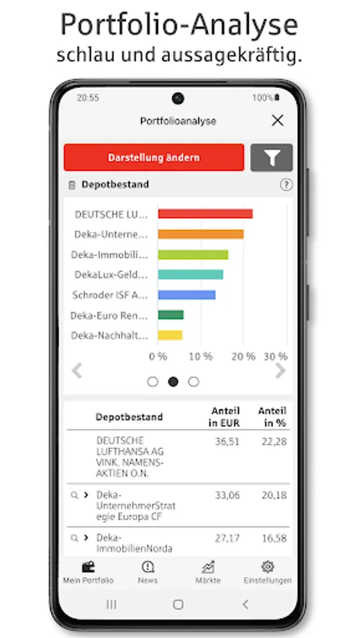 With S-Invest, a cooperation between Sparkasse and Deka, you can manage all securities accounts in one app: In addition to accounts from Deka and Sparkassen, bevestor and S Broker, accounts from other banks can be integrated. Changing to third-party systems is not necessary.