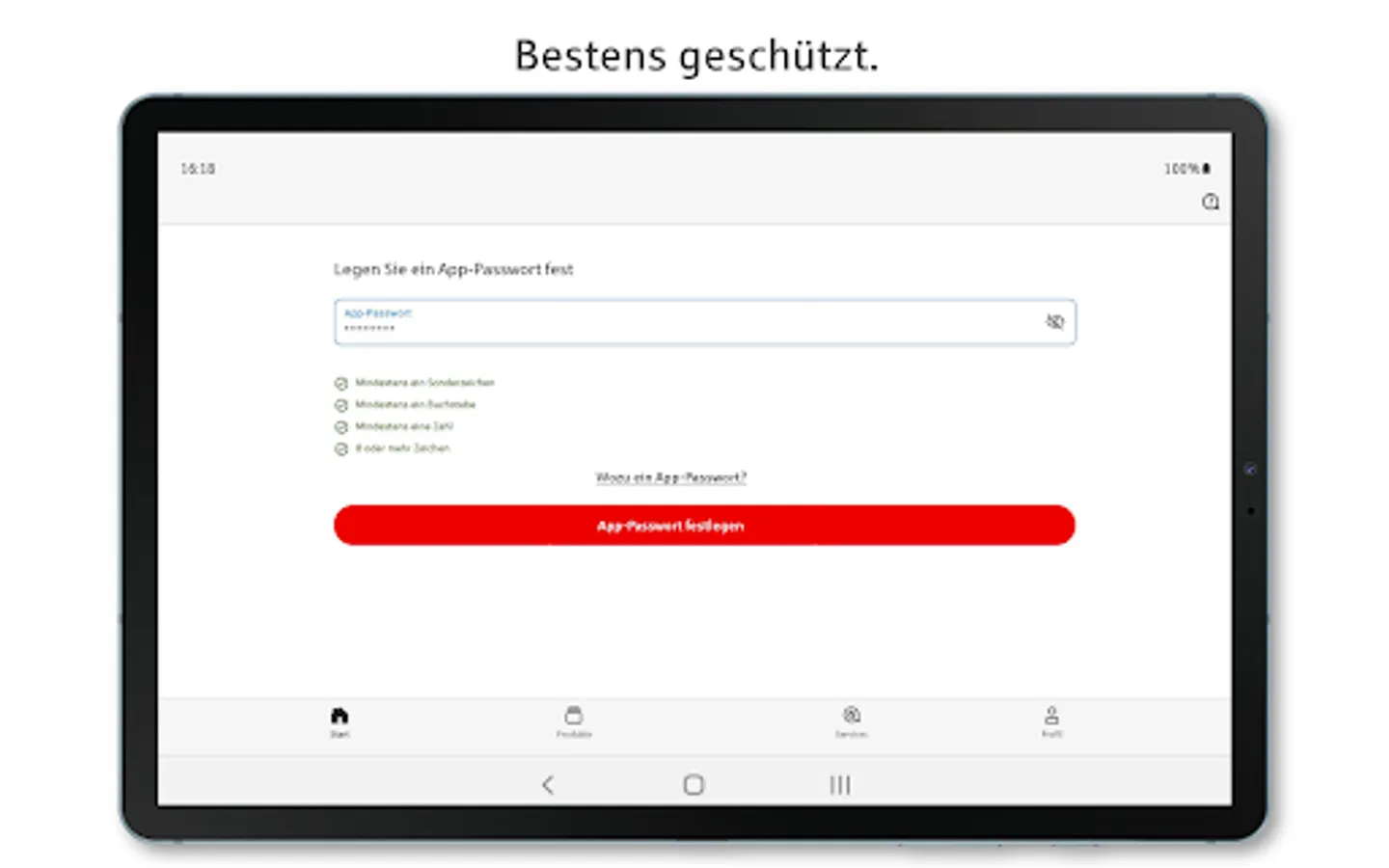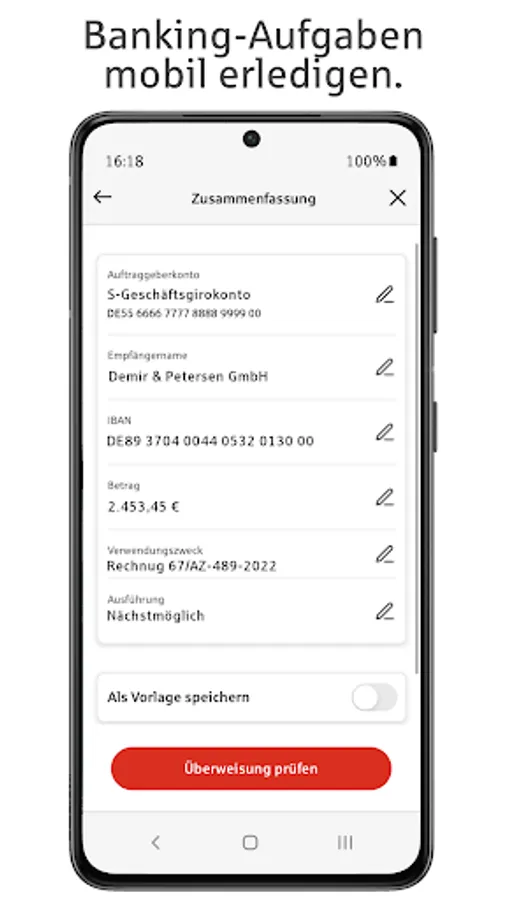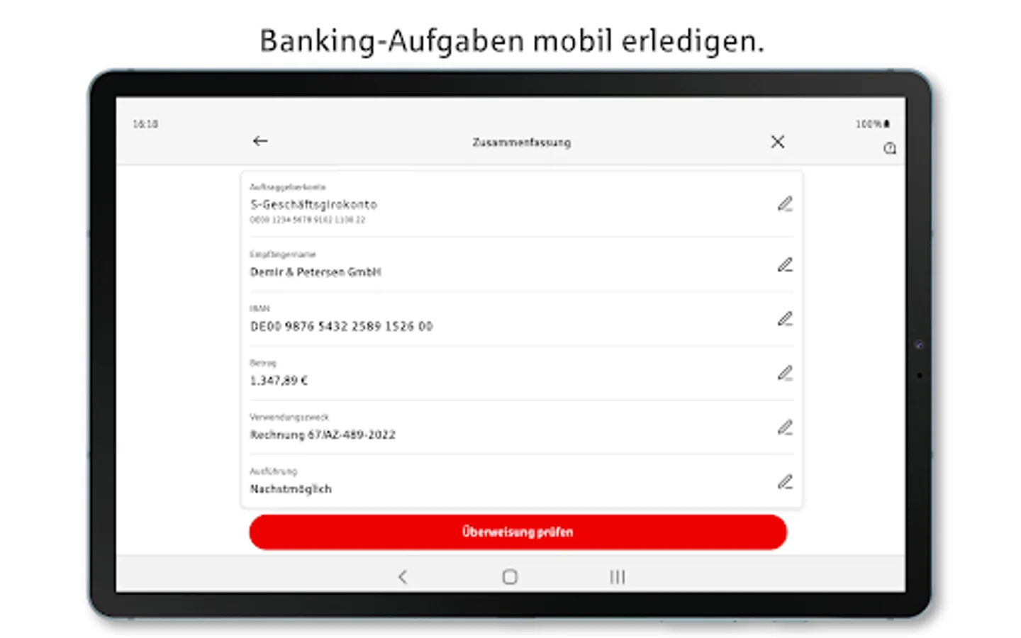 If you use a high-quality, up-to-date banking app in connection with an up-to-date operating system and a secure internet connection, you don't have to worry about mobile banking. The Sparkasse Business app communicates via tested interfaces and ensures secure data transfer in accordance with German online banking regulations. All data is stored encrypted. Access is protected by a password and optionally by fingerprint/face recognition. The autolock function locks the app automatically. All finances are maximally secured in the event of loss.