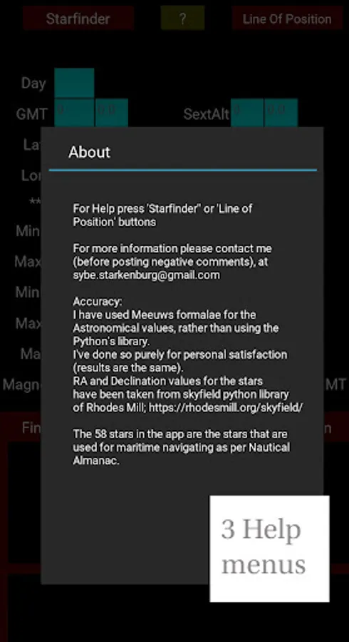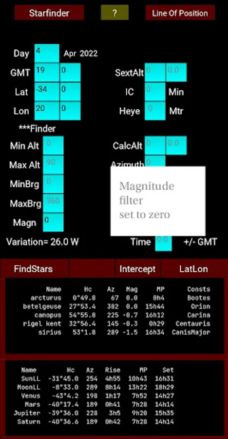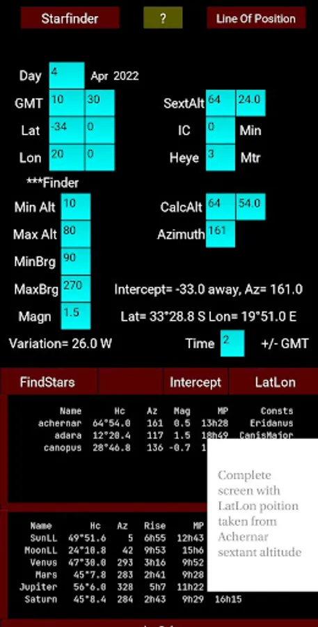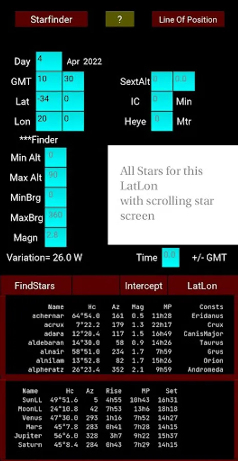 There are no 'bells & whistles' here, but the app gives what is essential and necessary, 58 of the brightest stars and how to find them, sun, moon and planets and a ‘line of position’ (LOP) for the navigators. Two LOP’s constitute a fix.