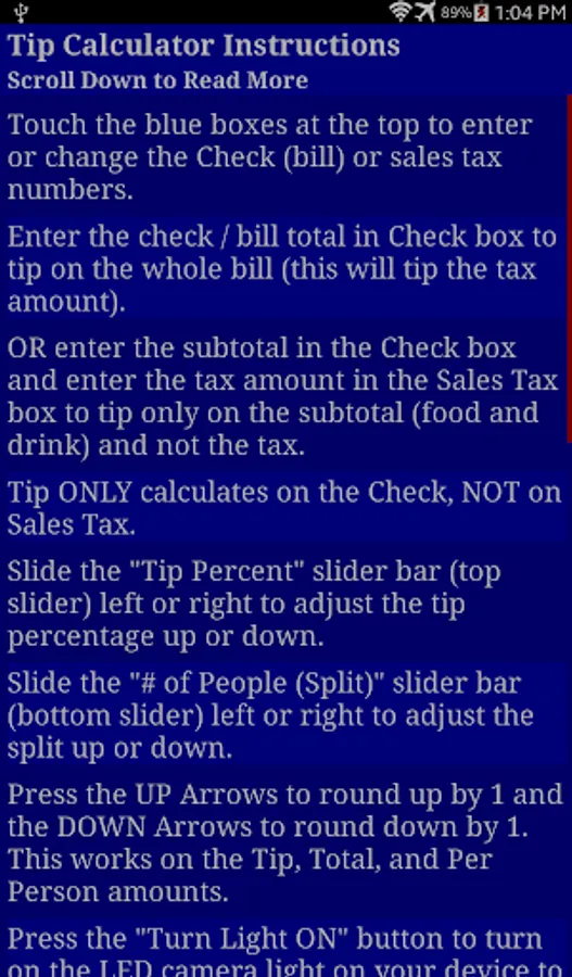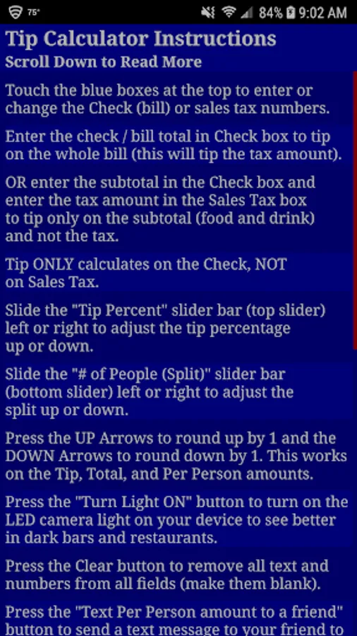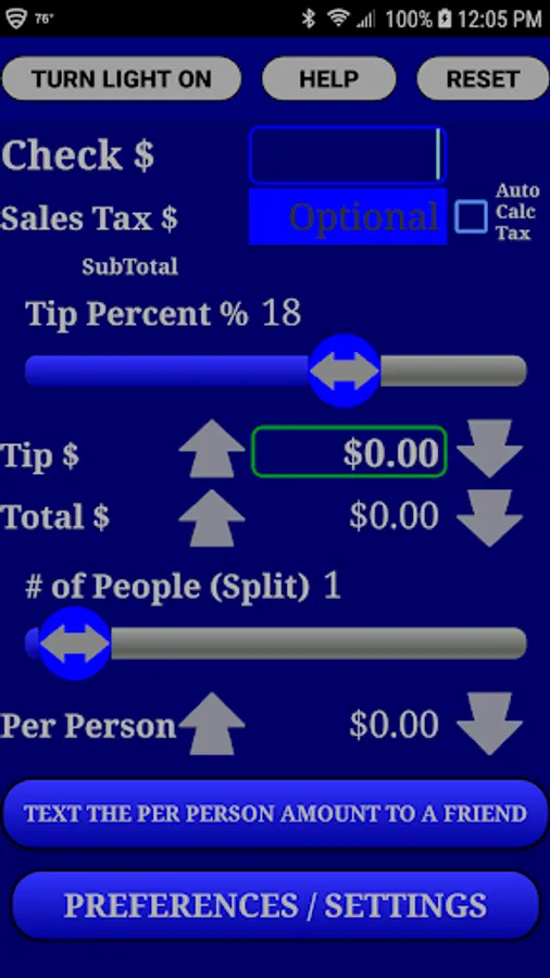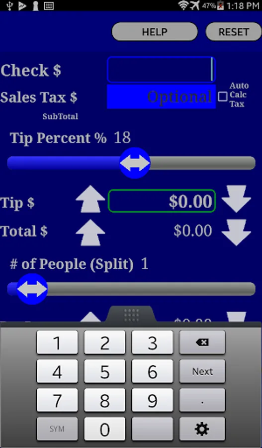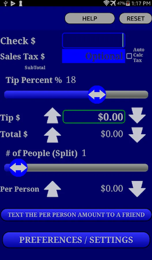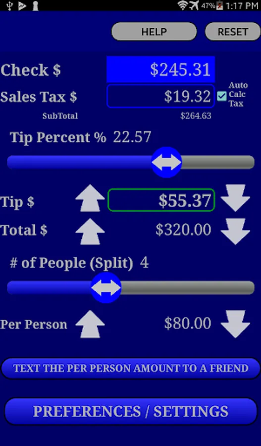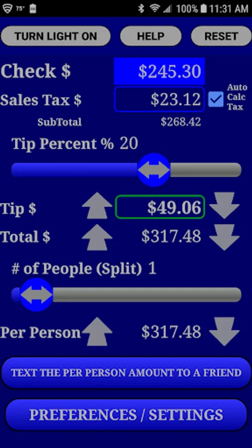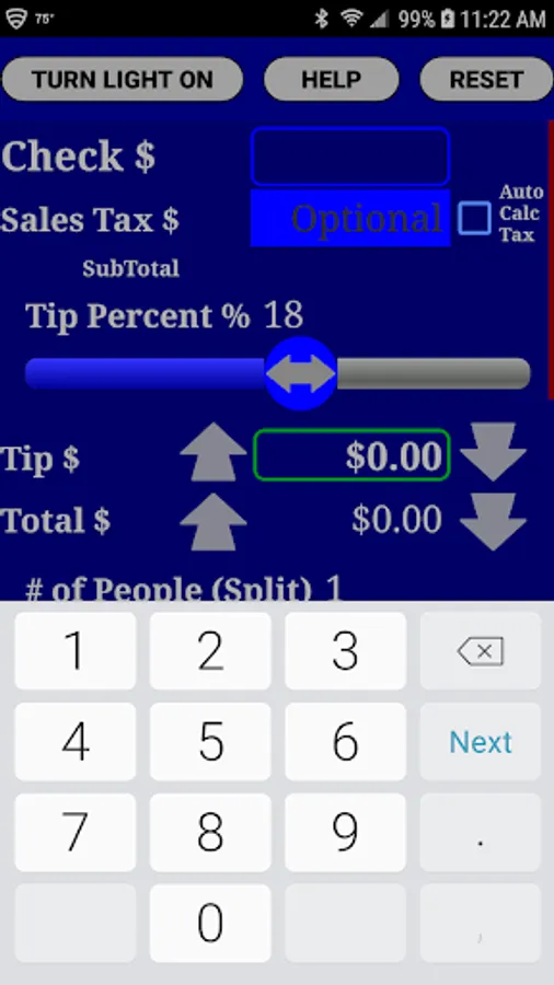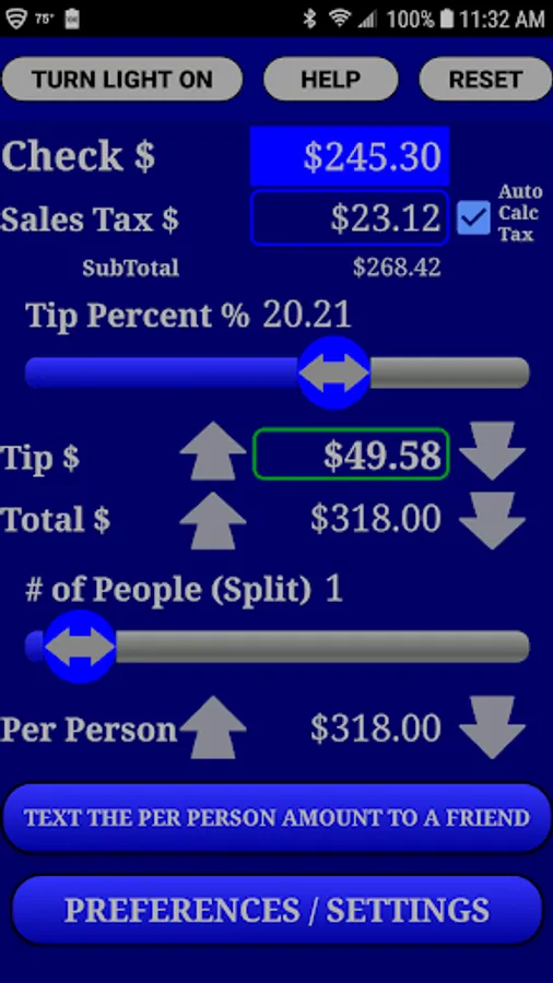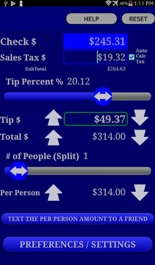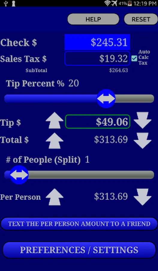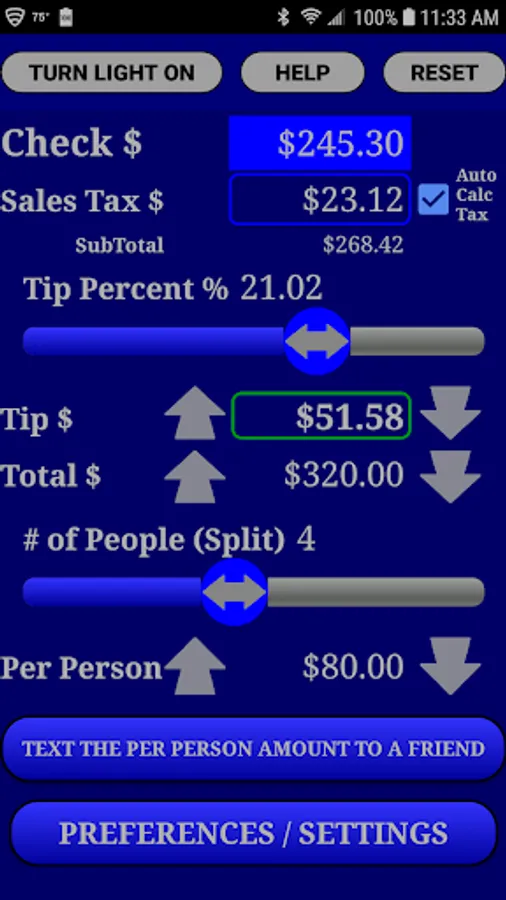5. Slider Bars let you change the Tip % and Number of People (split) easily and quickly.