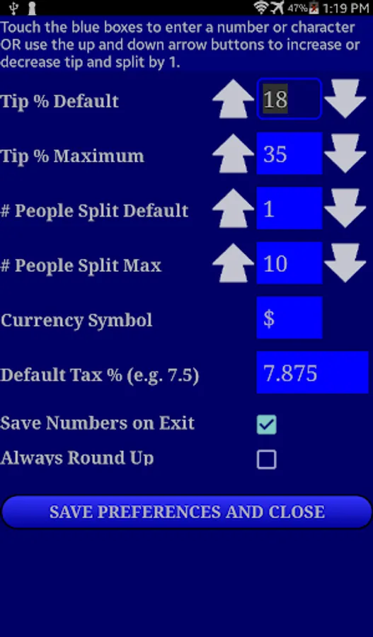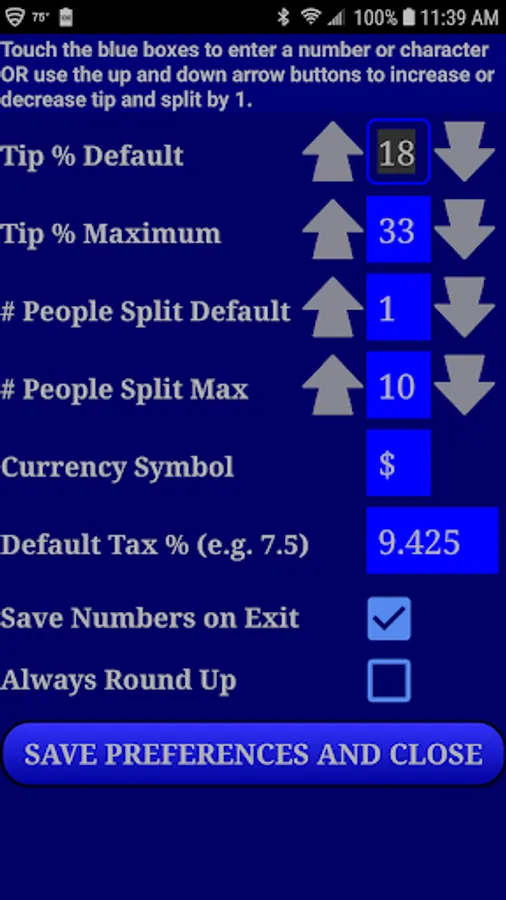 2. Allows you to set your own preferences including: Default Tip %, Maximum Tip %, Default Split Number, Maximum Split Number, Currency Symbol, Automatic Rounding, and whether you want to save your numbers upon exiting the app.