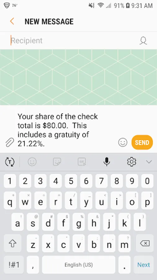7. Text the Per Person (Split) $ amount to a friend with the touch of a button.