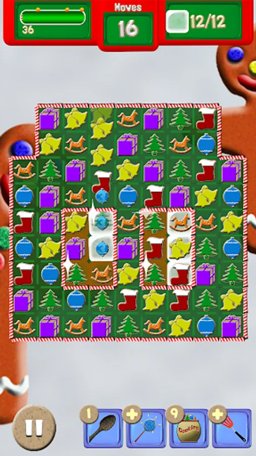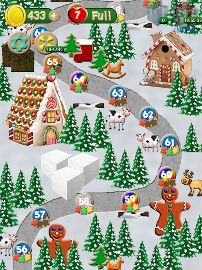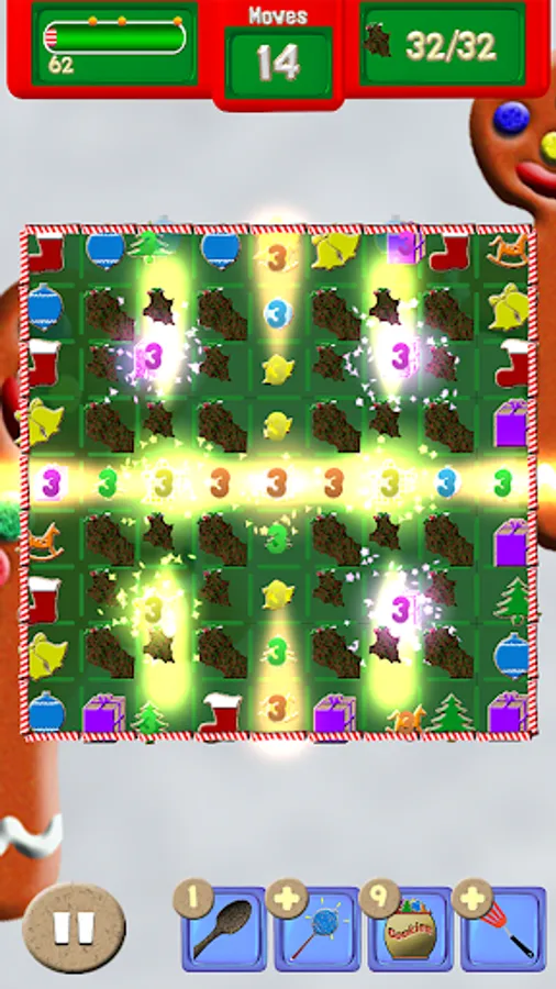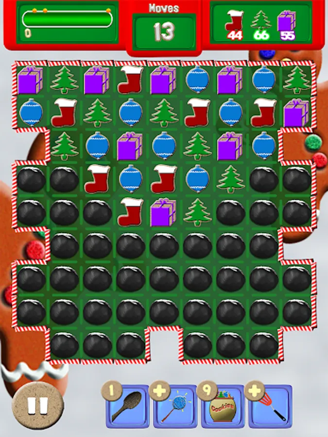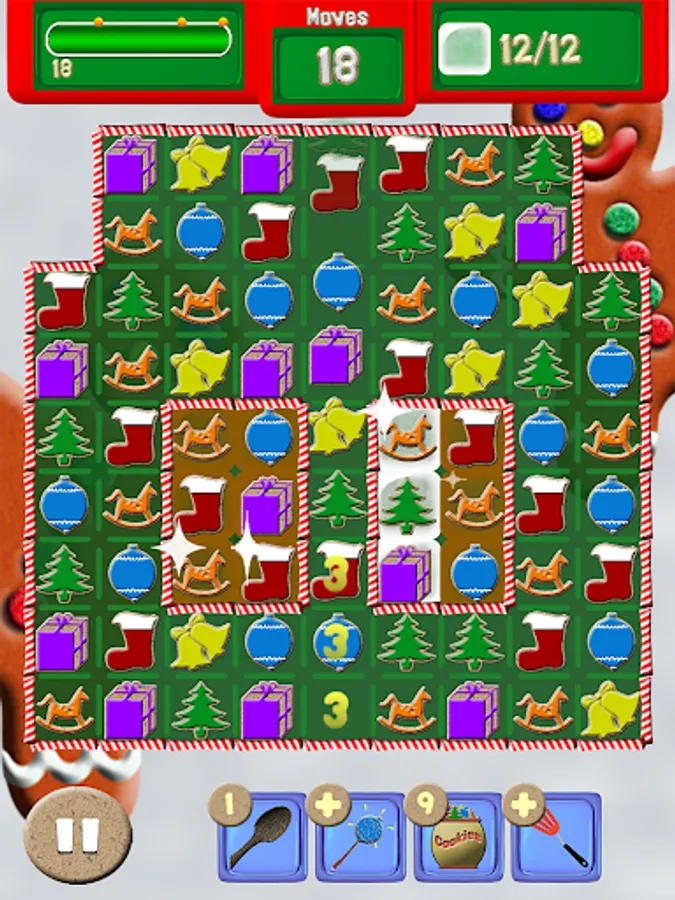Clean up spilled milk and hot cocoa to keep the cookies crisp. Create sprinkle bombs to crunch away more cookies. Each level has its own objectives including scoring, time, and more. Beware the dreaded fruit cake! Munch it away to clear the way. Watch out for naughty coal blocking your path.