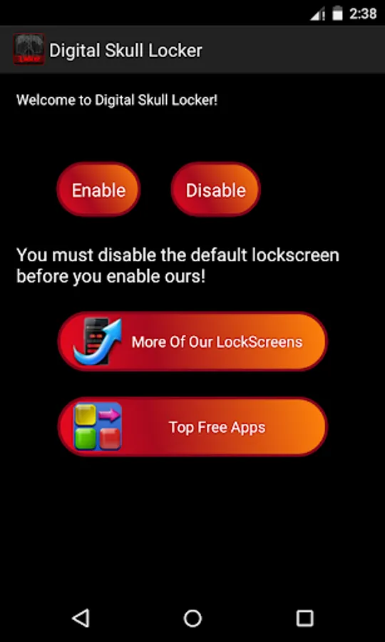 In order to enable "Digital Skull Locker" application, you need to enter the app and click at the Enable button. This way the default lock screen will be replaced.