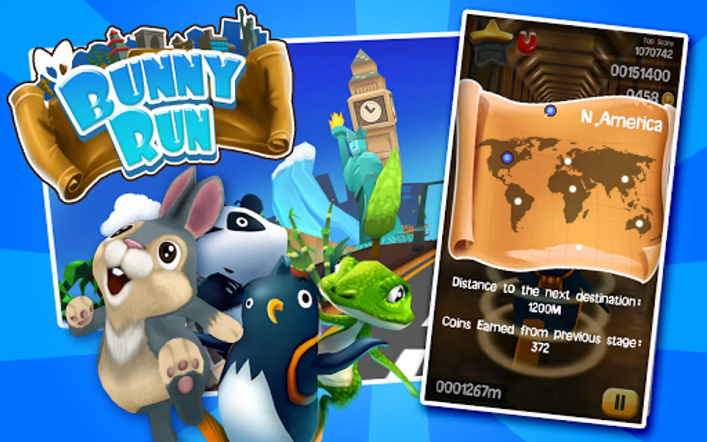 Bunny Run is a FREE game with addictive and exhilarating arcade gameplay. Help the cute bunny as he runs, jumps, slides and whirls through the underbrush to outrun and outmaneuver the fearsome Grizzly Bear in this high-octane chase!