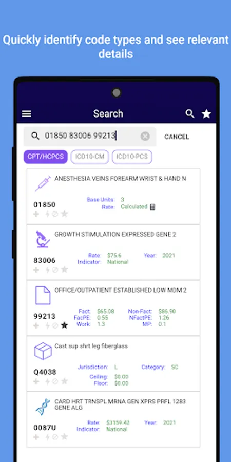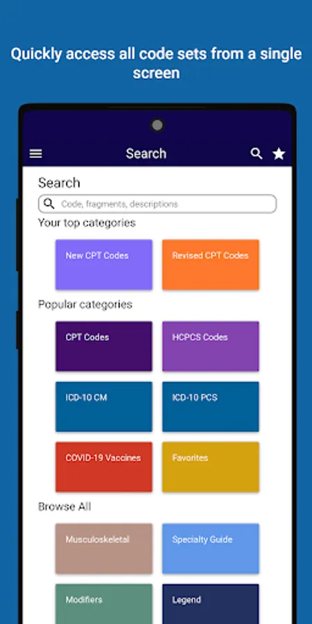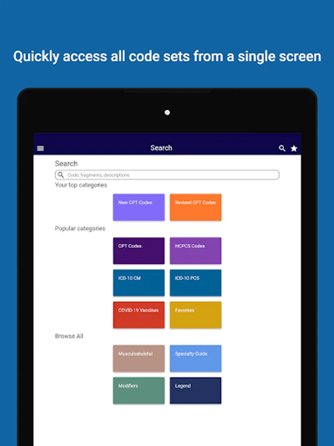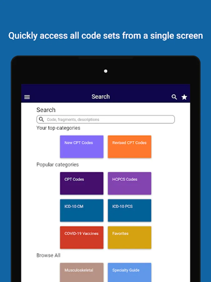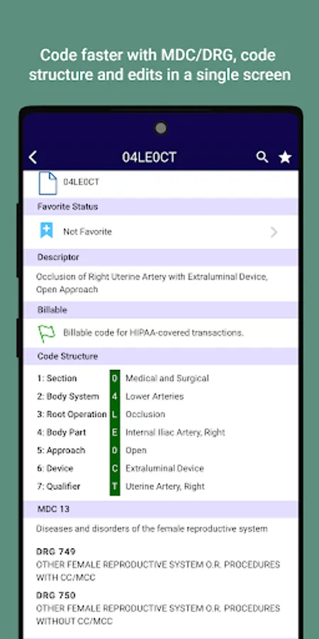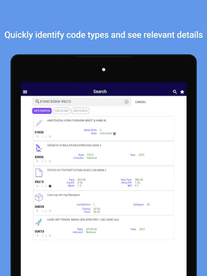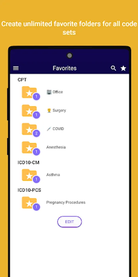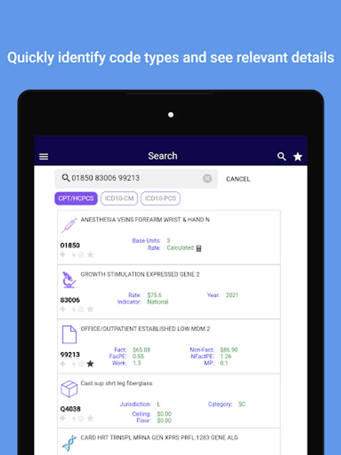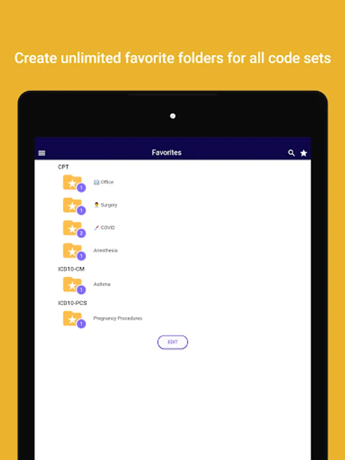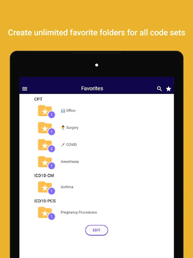 Find and organize an unlimited list of your favorite codes with as many folders as needed. Save time by creating folders for procedures and diagnostics for every scenario you encounter.