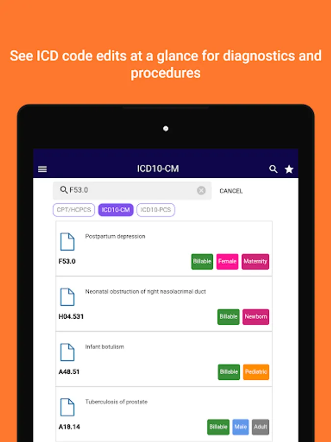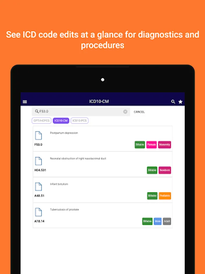 Get results for queries with typos such as 'asthmo' and partial words such as 'ten fing'. To compare, look for 'elbow mass' on any other ICD10 app on the App Store, and you will be surprised.