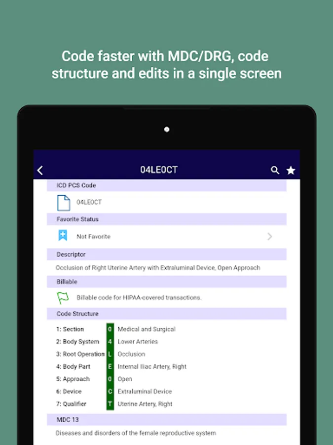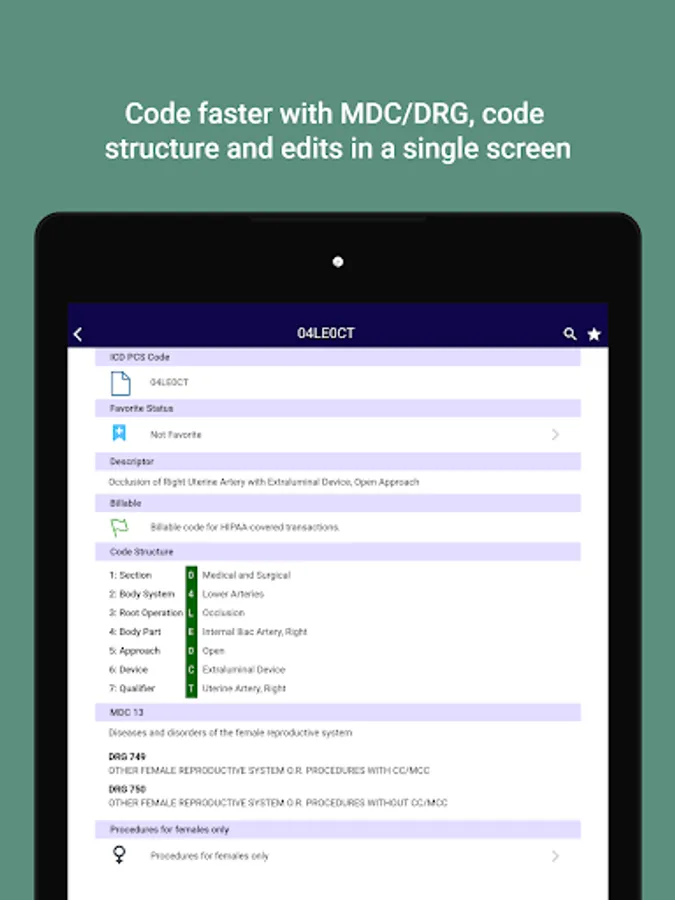Browse the ICD10 chapters or build PCS codes step by step by constructing the code structure. iCoder includes MDC and DRG codes for all codes and code edits such as Female Only, Male Only, Maternity, Newborn, Pediatric, Adult Only, and Manifestation Code.