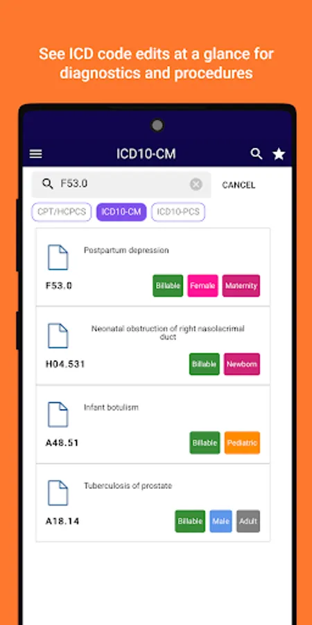 iCoder will show you all ICD10 that match your chosen CPT® code and even display your favorite diagnostics that match your CPT® code first.