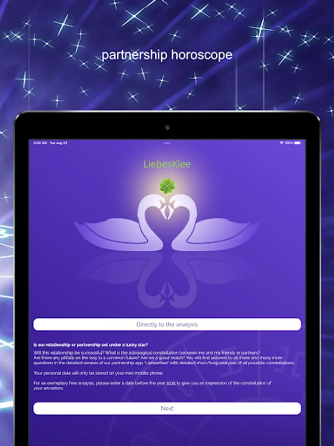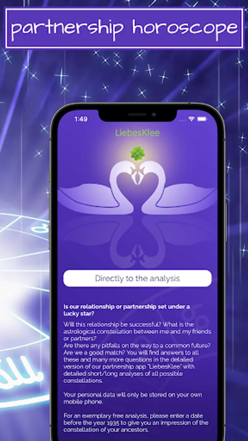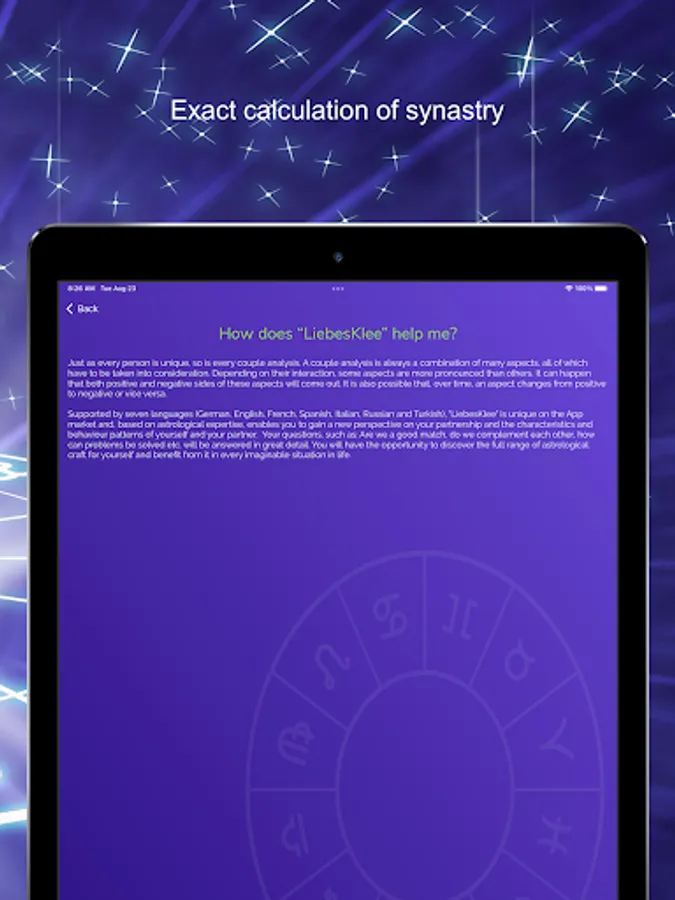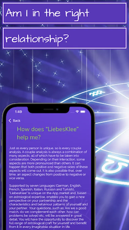 LiebesKlee aims to address these and many other questions concerning social relationships and interactions with each other. With the support of seven languages (German, English, Spanish, French, Italian, Russian, Turkish), the app offers the opportunity to discover the full range of astrological craft at reasonable prices.