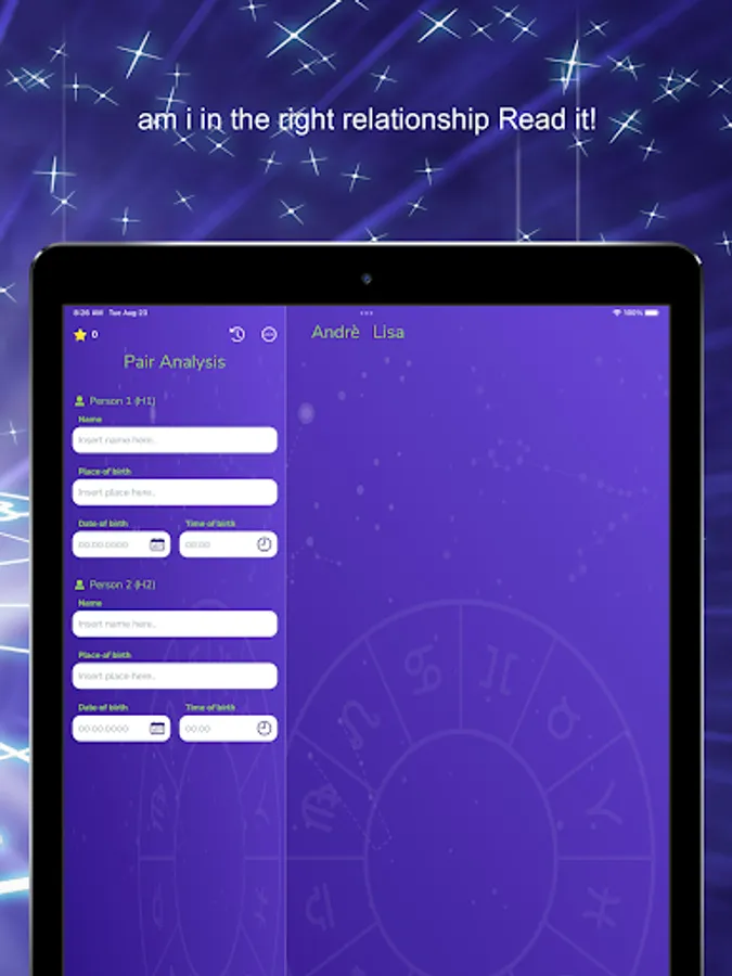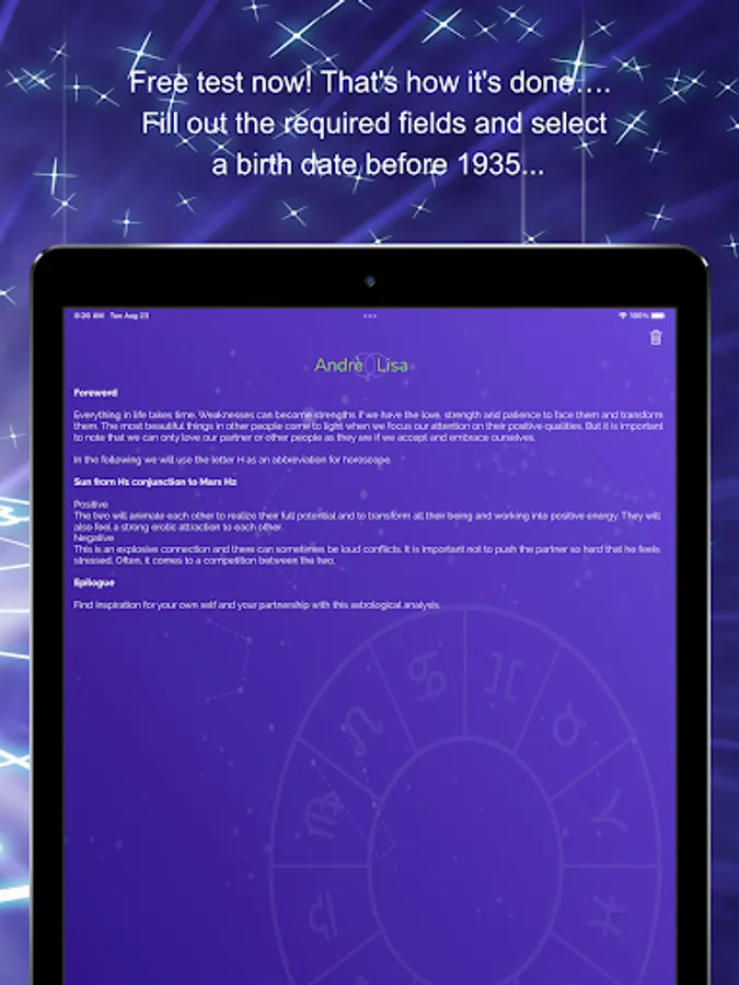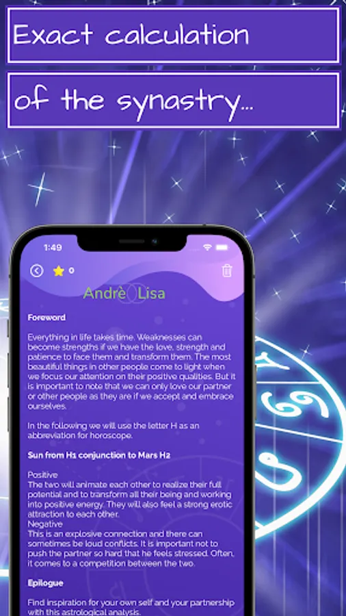 On the path through the zodiac sings and houses, new angular relationships emerge frequently. These relationships are called aspects. Like everywhere else, there are positive aspects that promote each other and negative aspects that disturb each other or lead to tension and conflict. Every horoscope, and therefore every comparison of different horoscopes, has different aspects. LiebesKlee, the astrology app, has the power to replace a personal, astrological consultation!